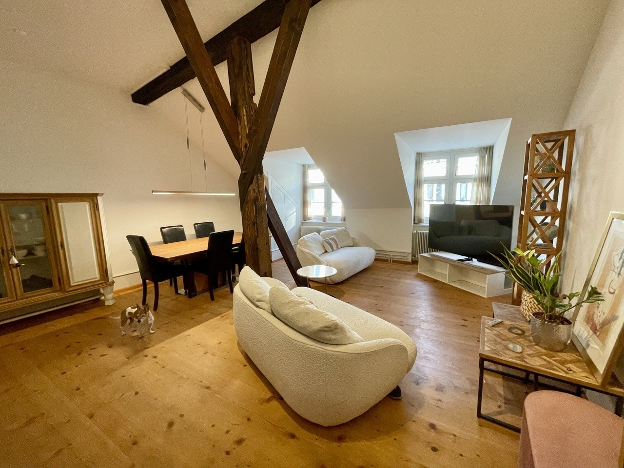 Spacious Living Area: Stunning living room showcasing original wooden beams and beautiful hardwood floors, furnished with a large comfortable couch, dining table, and entertainment area with television
