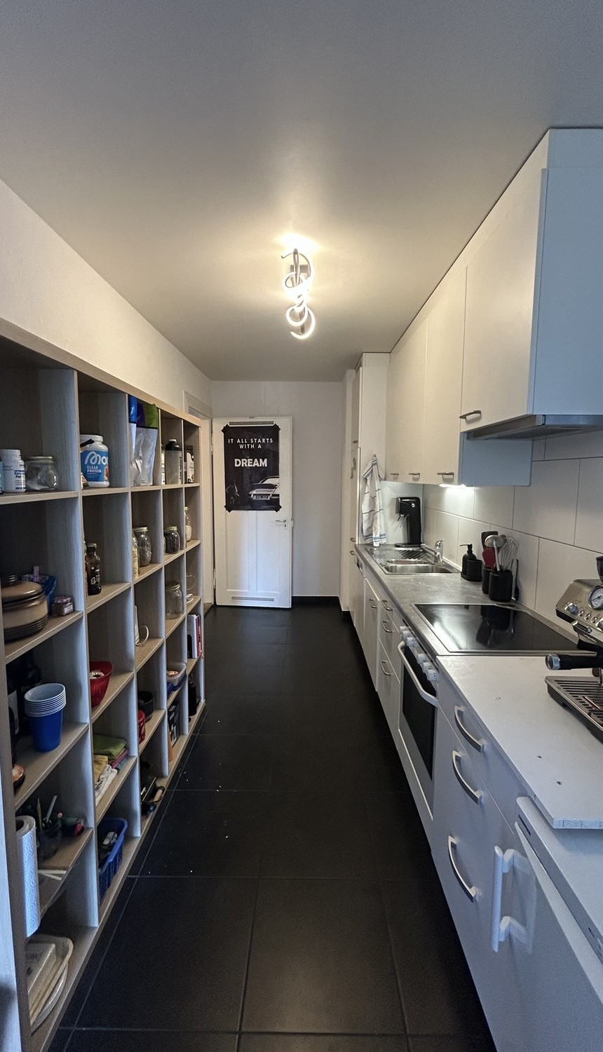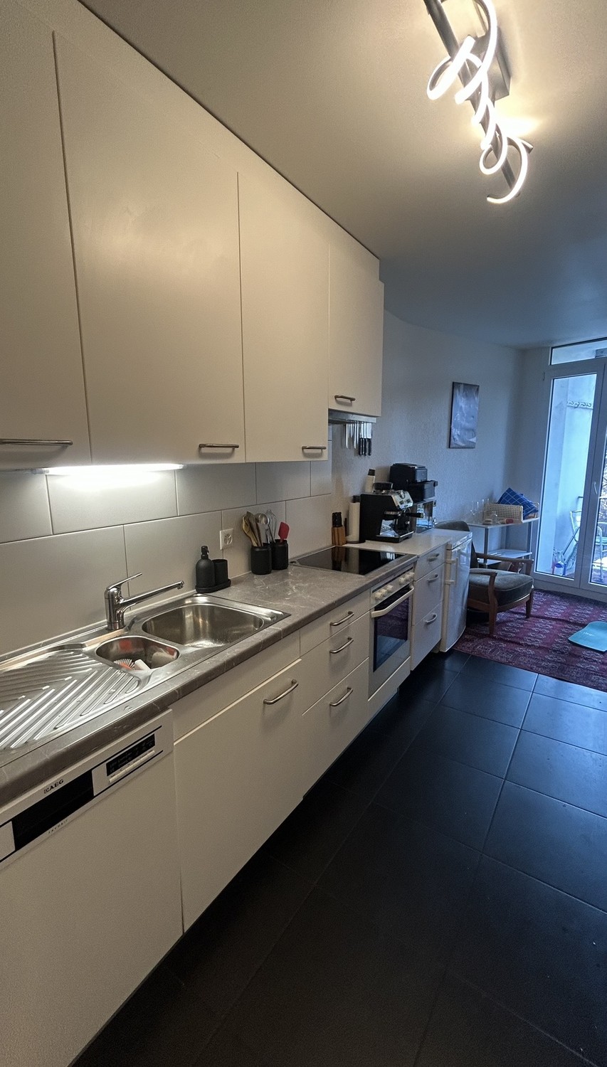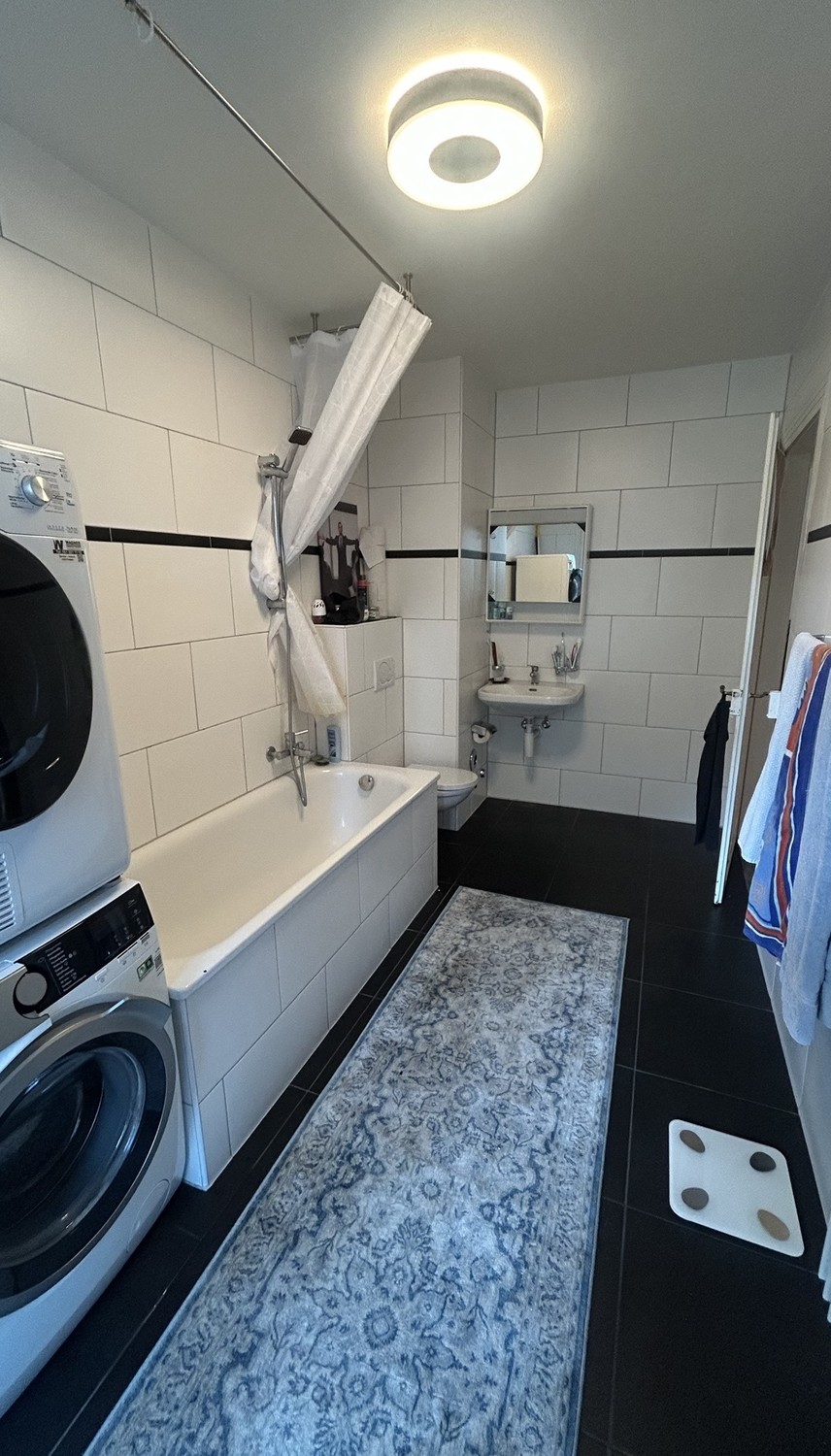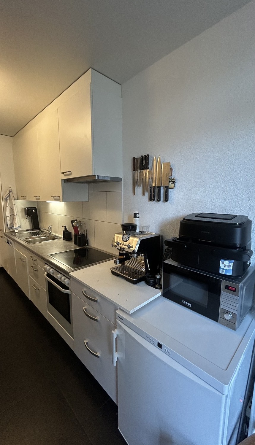 Küche, Bad und WC werden gemeinsam genutzt. In der Wohnung stehen eine eigene Waschmaschine und ein Tumbler zur Verfügung, zusätzlich gibt es auf dem zweiten Balkon ein Eisbad. Die Küche ist vollständig ausgestattet und bietet alles, was man im Alltag benötigt, unter anderem eine Geschirrspülmaschine, eine DeLonghi Kaffeemaschine, einen Airfryer sowie einen Sodastream. Das Wohnzimmer ist mit Sofas, TV, Soundanlage, Philips Hue Beleuchtung sowie einem Esstisch mit Stühlen eingerichtet und wird aktiv gemeinsam genutzt.