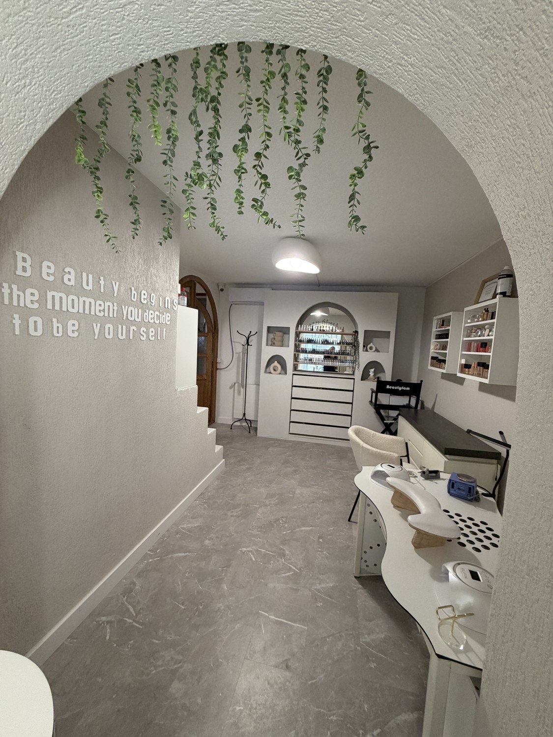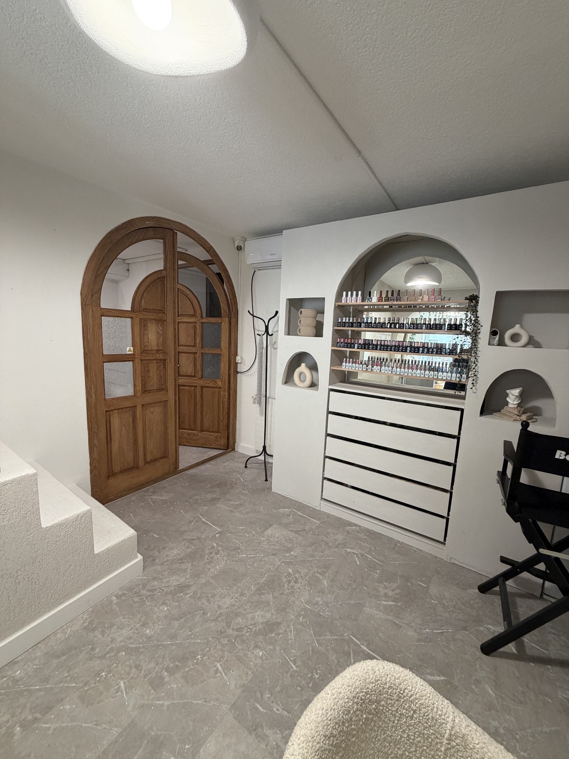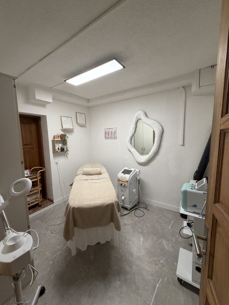 Behandlungsraum: großer, selbstgebauter ästhetischer Schrank sowie zwei Wandregale inklusive, Nageltisch von Jenny Swiss