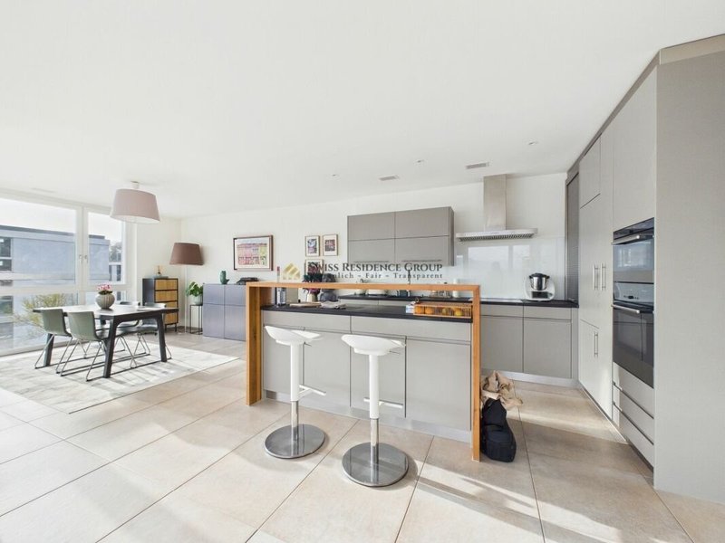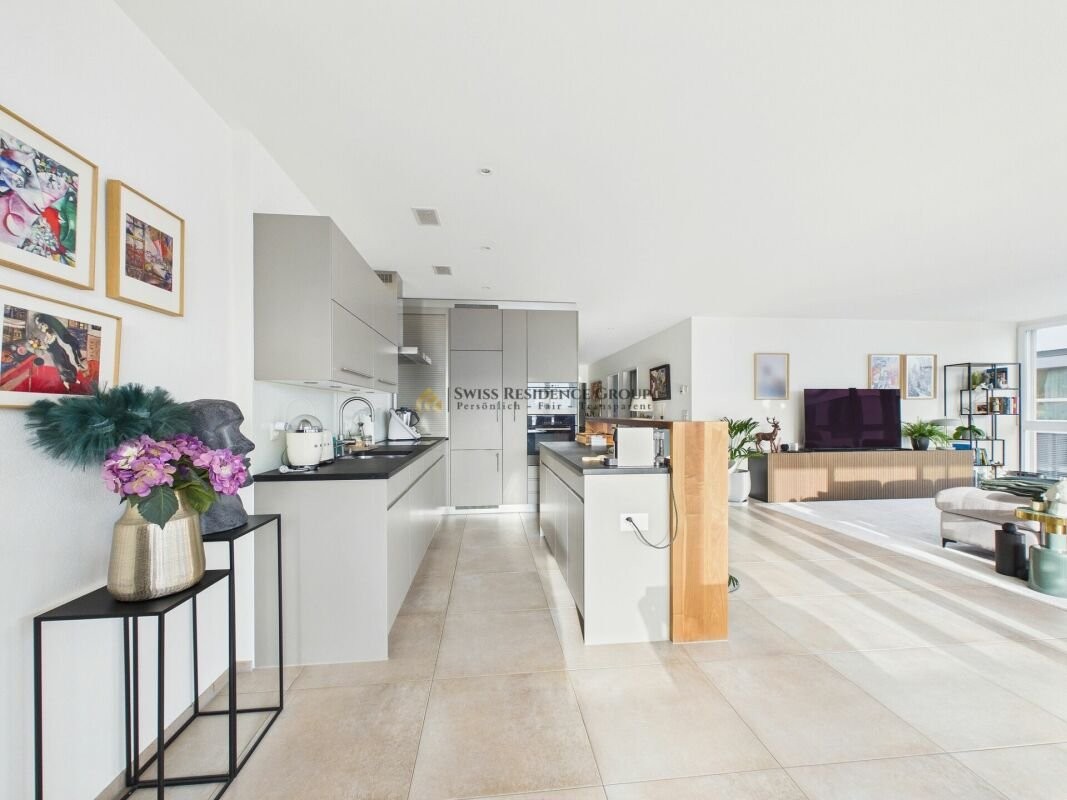 Das Herzstück der Wohnung bildet der grosszügige Wohn- und Essbereich (ca. 50 m²) mit viel Tageslicht und direktem Zugang zum verglasten Wintergarten (14 m²). Die offene, moderne Küche ist mit Steamer, Backofen, Geschirrspüler und einer stilvollen Holzbar ausgestattet.