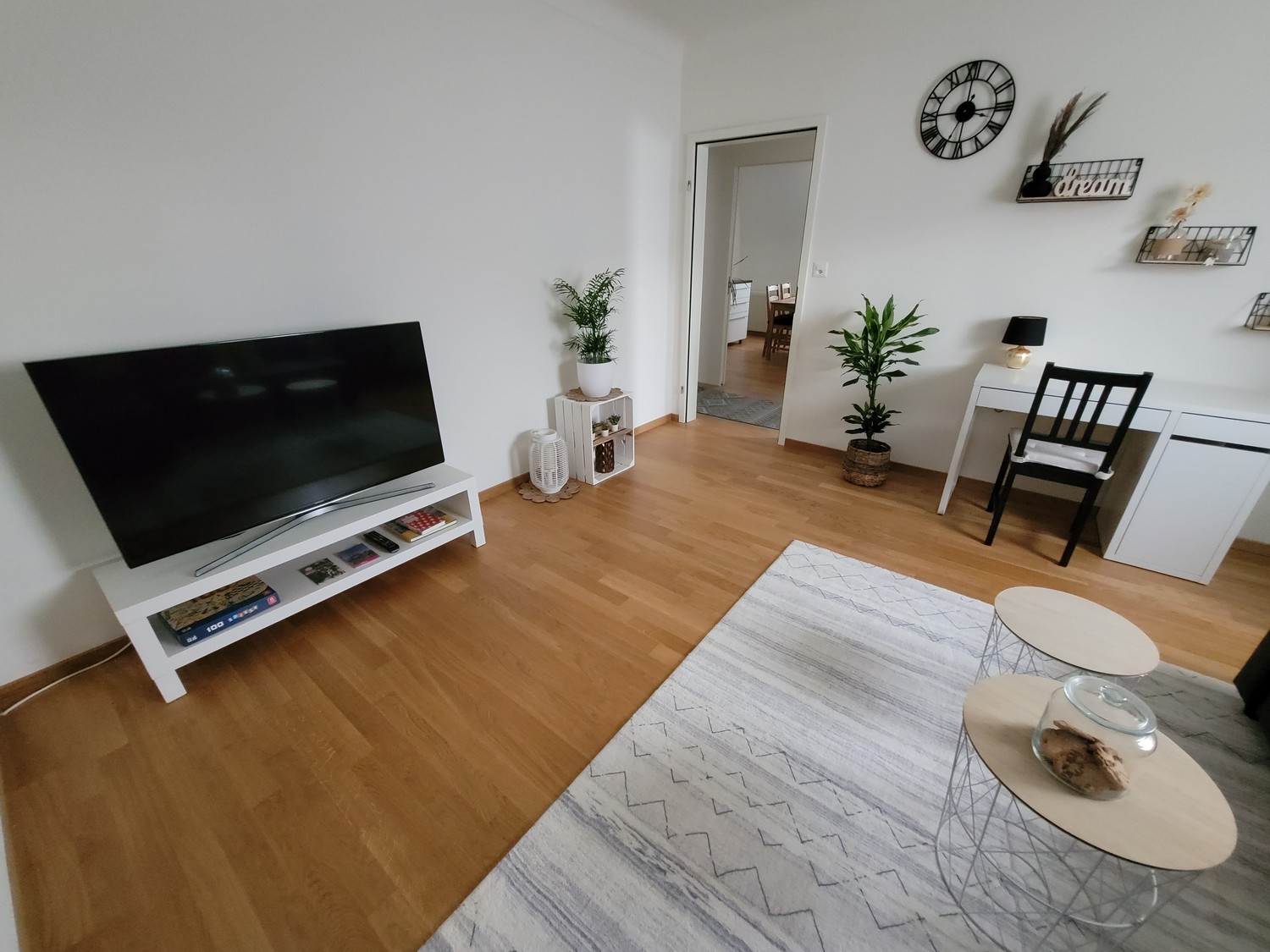 Wohnen & Schlafen: Helles Wohnzimmer mit Smart-TV. Gemütliches Schlafzimmer mit Queen-Size-Bett (1.60m) und hochwertiger Bettwäsche.
