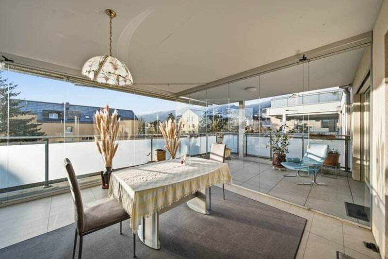 Der grosszügige, offen gestaltete Wohn- und Essbereich bildet das Herzstück der Wohnung. Dank der grossen Fensterflächen wirkt der Raum hell und einladend. Von hier aus gelangen Sie direkt in den verglasten Wintergarten sowie auf die westlich ausgerichtete Terrasse. Während der Wintergarten in den kühleren Monaten zusätzlichen, lichtdurchfluteten Wohnraum bietet, geniessen Sie im Sommer sonnige Stunden auf der Terrasse.