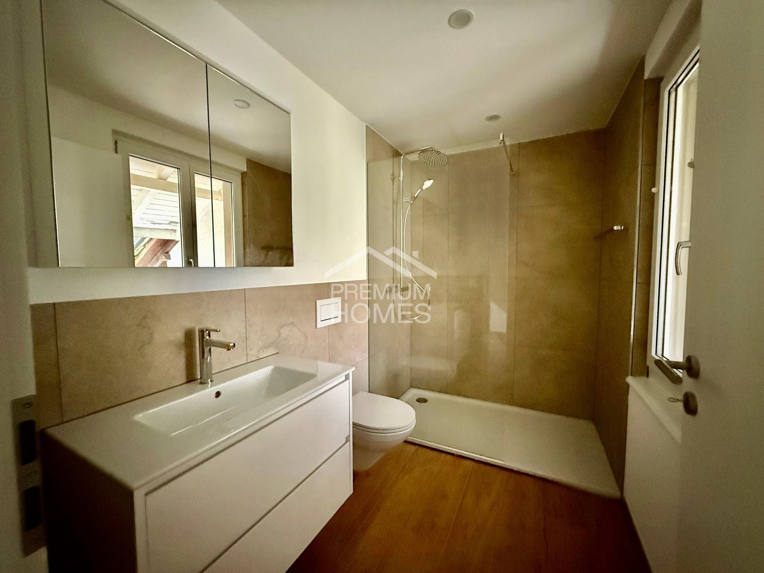 Hochwertige Materialien und sorgfältige Ausführung machen dieses Zuhause besonders charmant. Die massgefertigte Küche lädt zum Kochen und Verweilen ein, während das Badezimmer mit grosser, bodengleicher Regendusche für Wellnessmomente sorgt. Robuste Keramik im warmen Holzdesign verbindet Stil und Pflegeleichtigkeit.