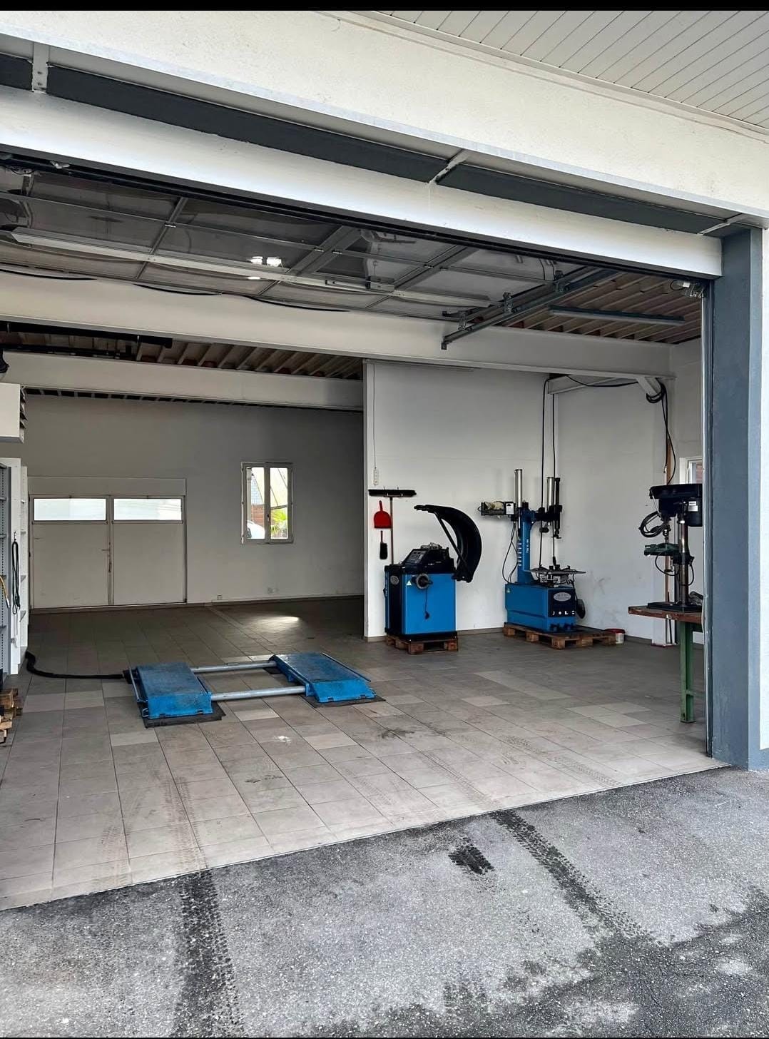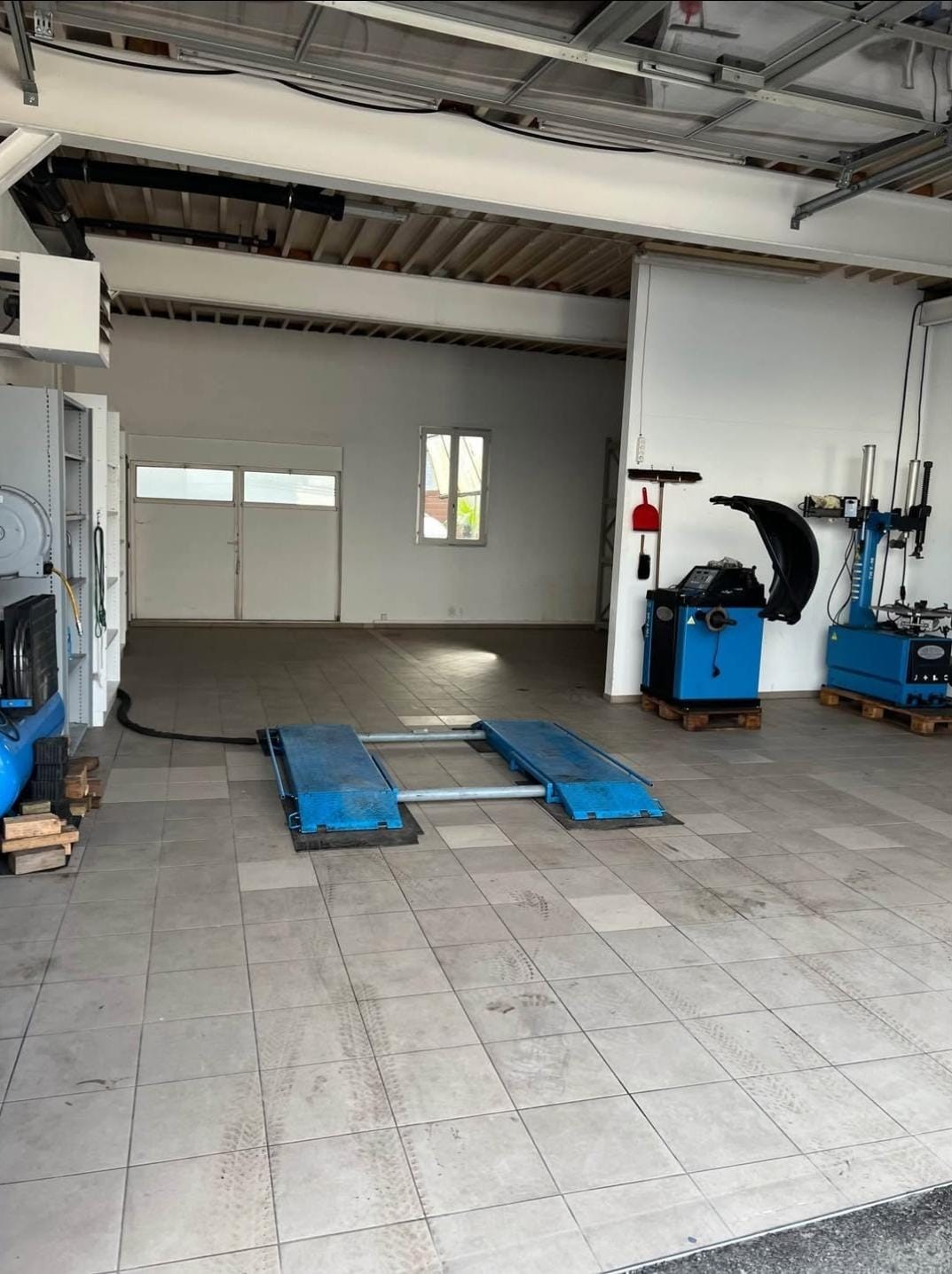 Grosszügiger Arbeitsbereich: 80 m² offene Werkstattfläche mit gefliestem Boden und deckenmontierten Leuchten