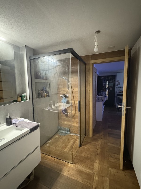 Im Bad hat es eine verglaste Dusche und Drei grosse einbauschränke die du als Kleider und Putzschrank brauchen kannst.