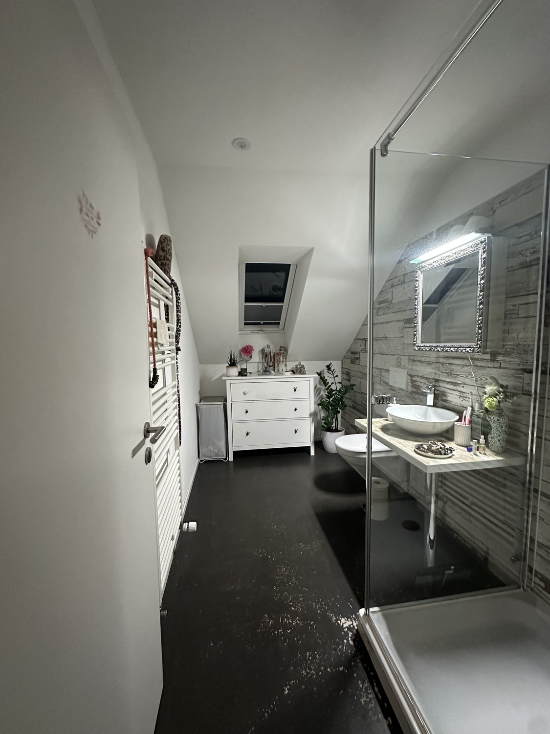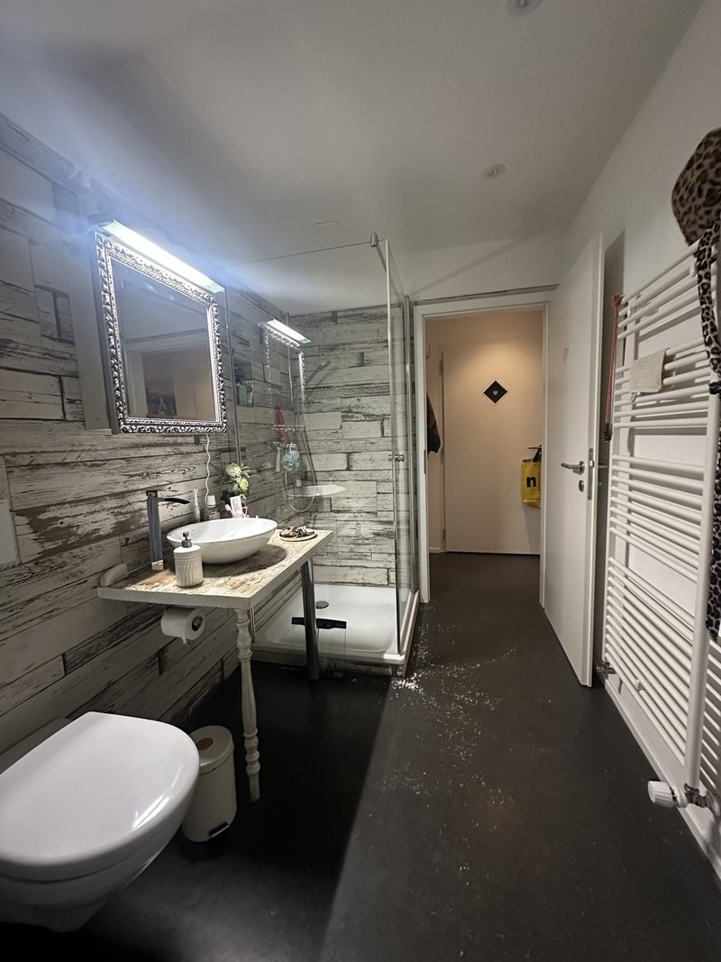 Mein Badezimmer ist ein echtes Schmuckstück! Geräumig, mit Dusche und WC sowie einem ausgefallenen Lavabo. Meine hübschen Wandfliesen lassen meine Besucher staunen – ein echter Hingucker, versprochen.