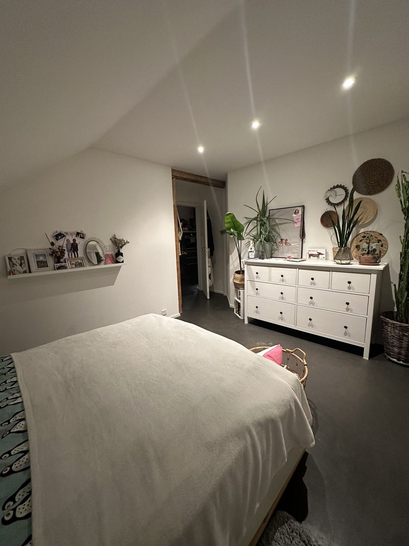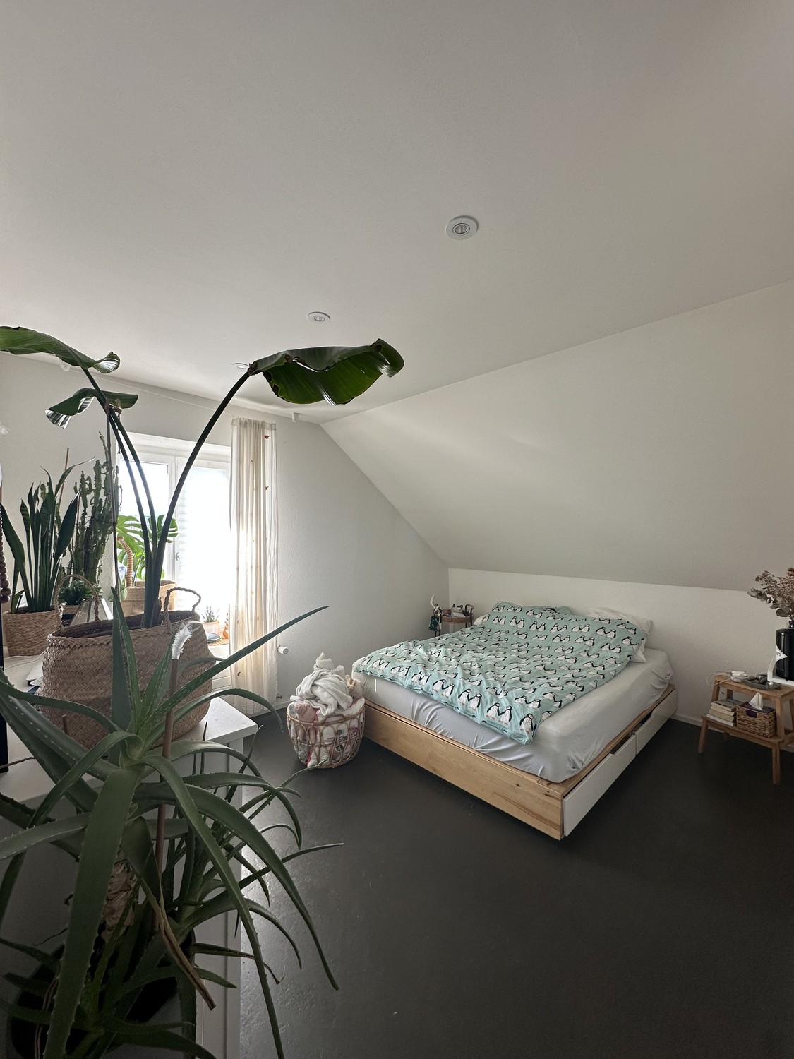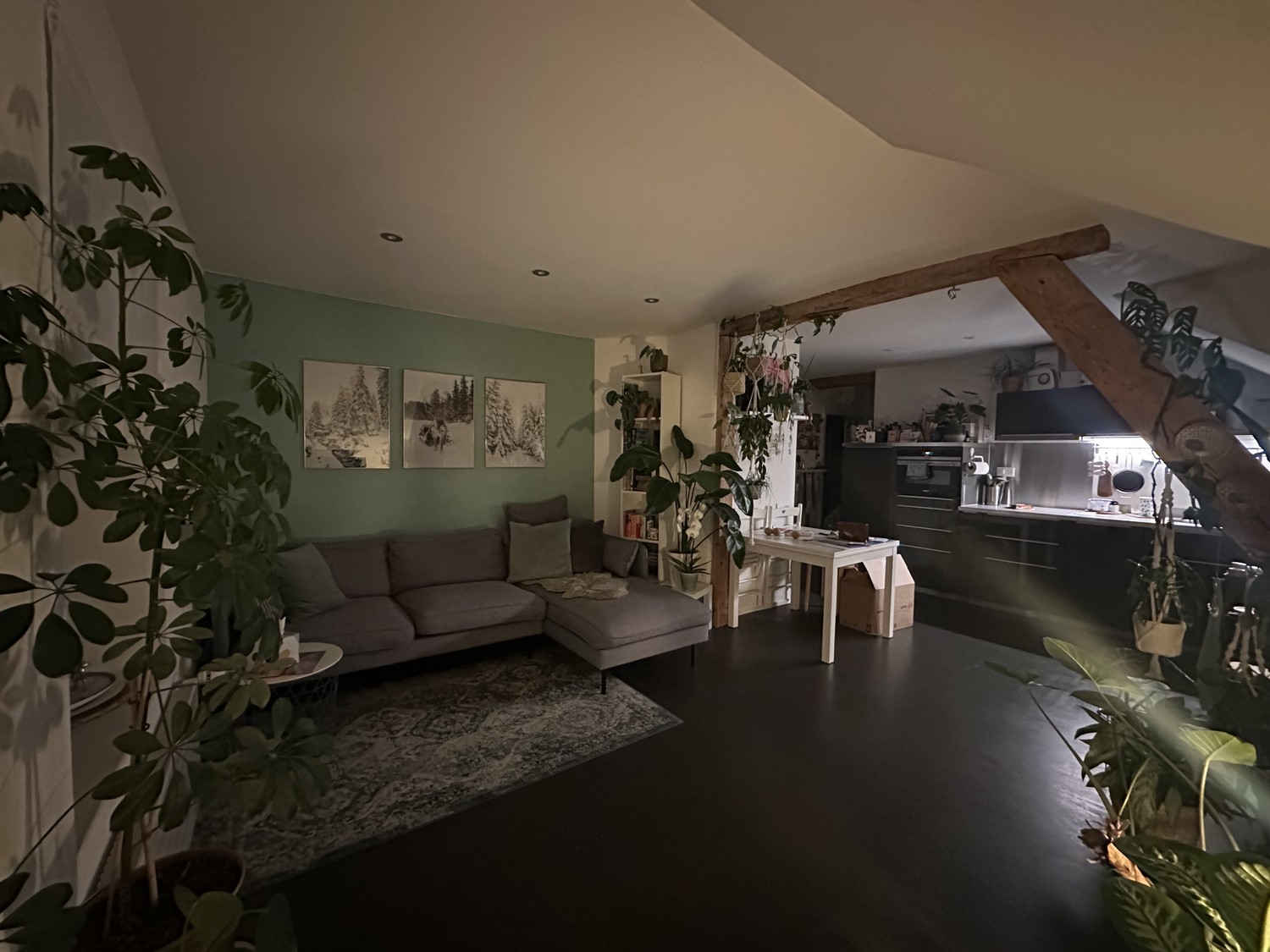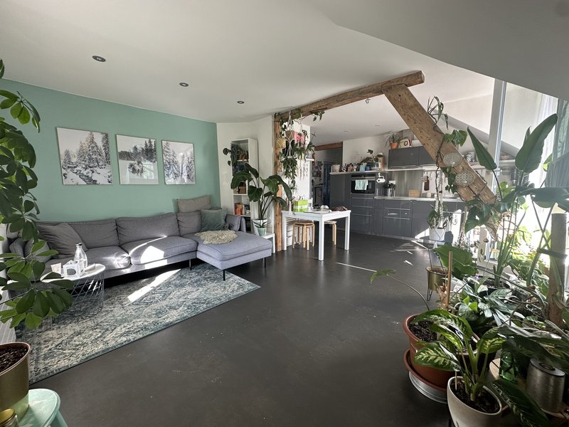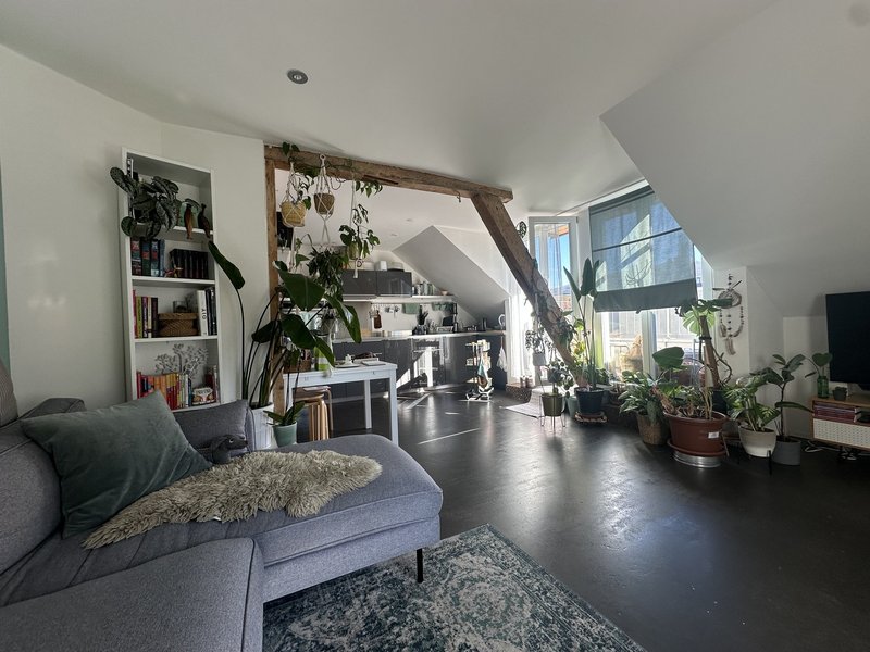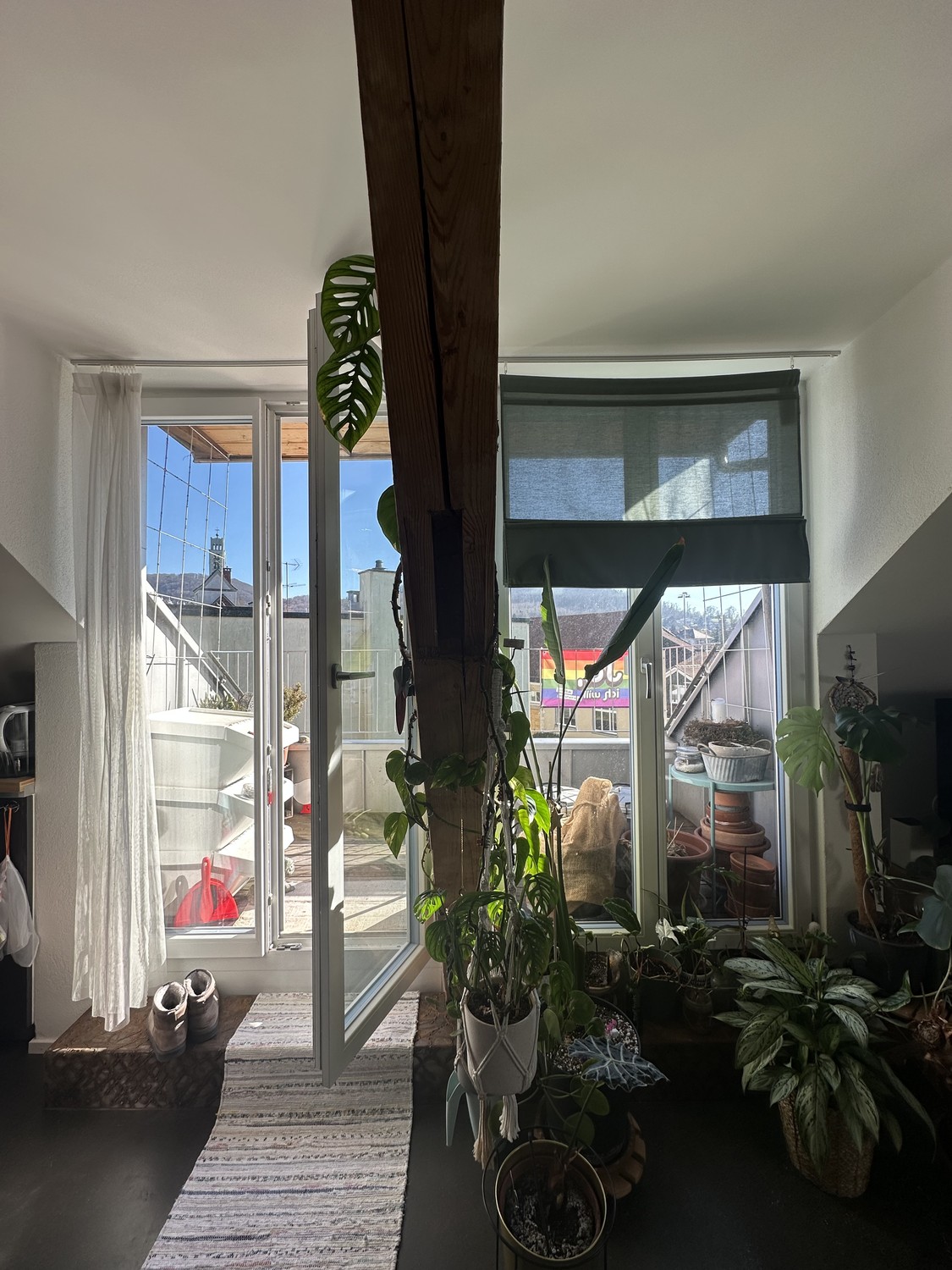 Ich wohne ganz oben unterm Dach und liebe es, wenn die Sonne durch meine Fenster tanzt. Meine Dachschrägen und die alten Holzbalken machen mich heimelig und bieten Kletterpflanzen viele Möglichkeiten zum Wachsen. Ich bin verspielt, gemütlich, aussergewöhnlich, einfach richtig zum Wohlfühlen und habe eine super Lage. Direkt über dem Oltner Bifang habe ich eine prächtige Aussicht in grüne Gärten sowie zum Sälischlössli oder auch dem Born. Zu Fuss bist du innert fünf Minuten im Sälipark und am Bahnhof bereits fünf Minuten später. Auch mit dem Auto bist du rasch in Richtung Aargau, Trimbach, Gösgen und dem Gäu. Nur ein Parkplatz kann ich dir nicht bieten ausser die in der blauen Zone vor dem Haus.