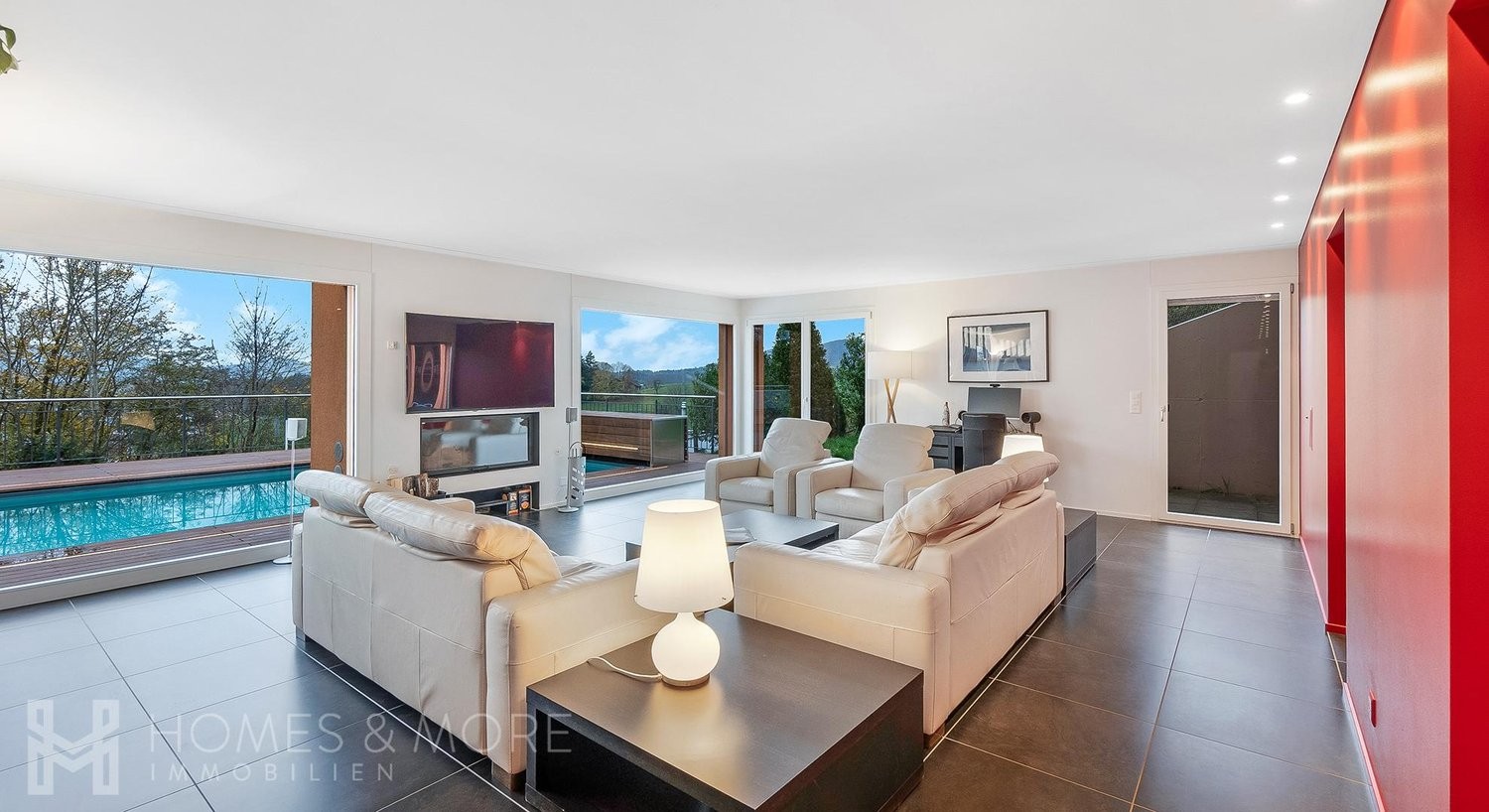 Im Erdgeschoss entfaltet sich das Herzstück des Hauses: Der lichtdurchflutete Wohn- und Essbereich mit offener Traumküche. Diese begeistert mit modernster Ausstattung und hochwertigen Materialien - ein Ort, an dem Kochen und Genuss verschmelzen. Vom Wohnbereich gelangen Sie direkt auf die grosszügige Terrasse mit beheiztem Pool und Gegenstromanlage - perfekt für entspannte Stunden im Freien. Im bergseitigen Bereich finden Sie zusätzliche Nutzflächen, einen Waschraum sowie ein Badezimmer mit Dusche/WC.