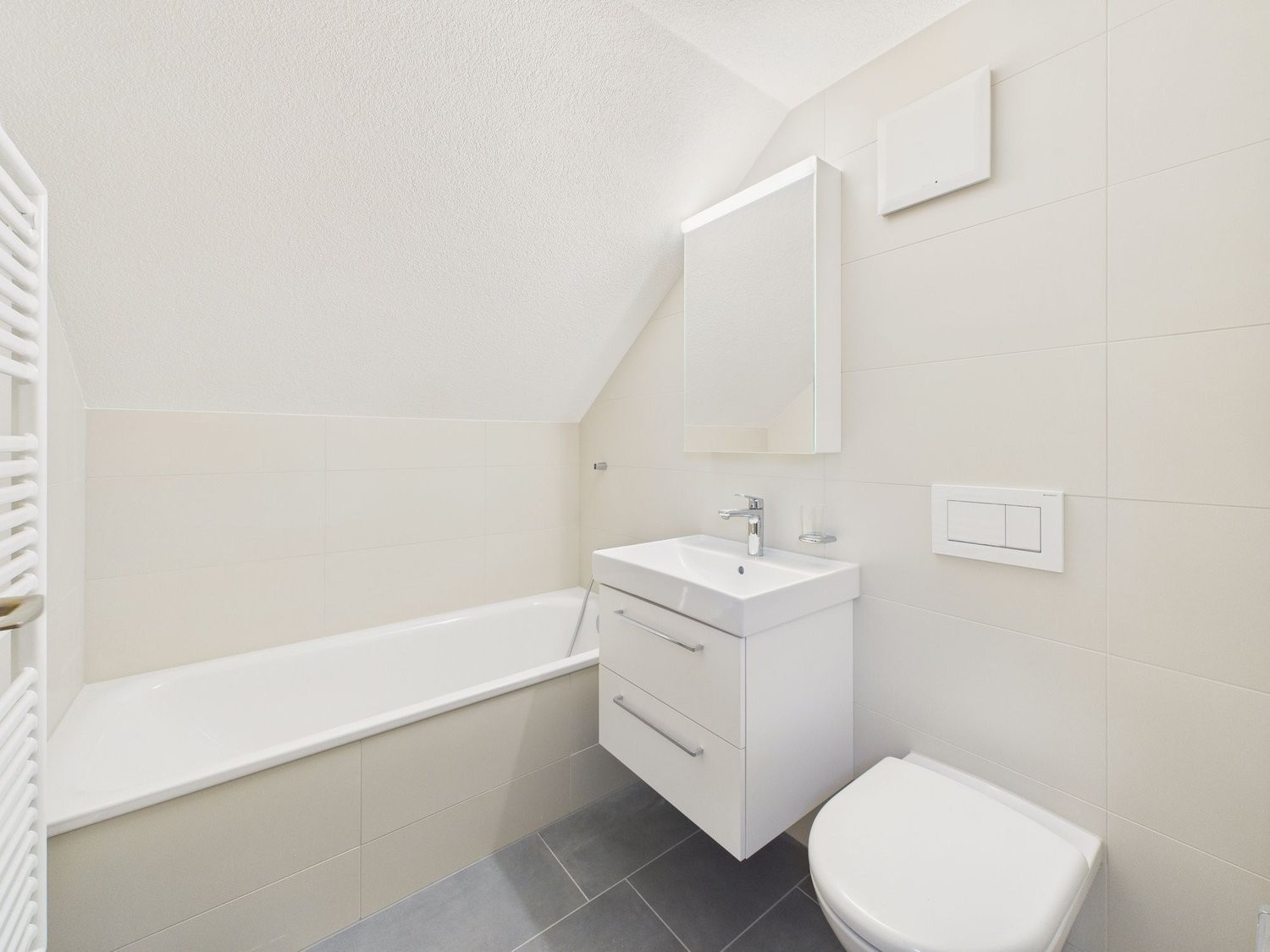 Moderner Plattenboden im Eingangsbereich, in der Küche, im Wohnbereich und im Badezimmer