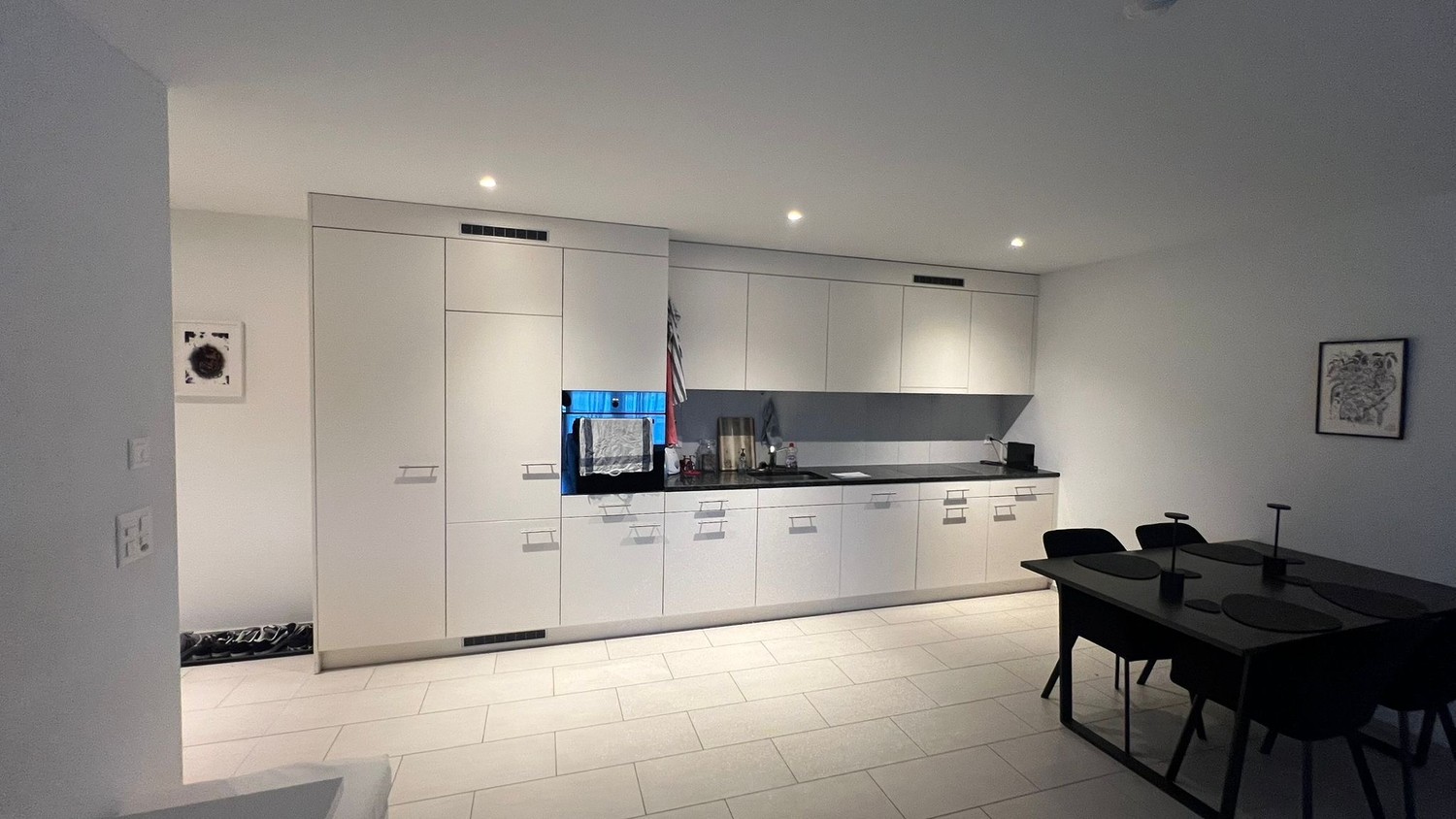 Offener Wohnbereich: Modernes minimalistisches Design mit weissen Wänden und offenem Grundriss, der Wohnzimmer, Essbereich und Küche harmonisch verbindet