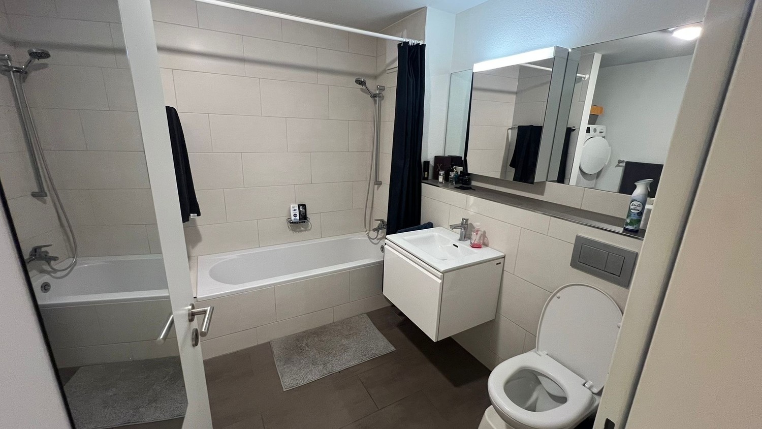 Moderne Badausstattung: Ein Bad mit weissen Fliesen, Badewanne, Dusche und zeitgemässer Ausstattung