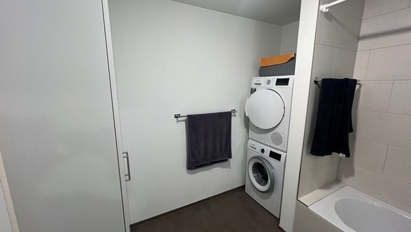 Praktischer Waschraum: Eigene Waschmaschine und Trockner im Badezimmer für maximalen Komfort