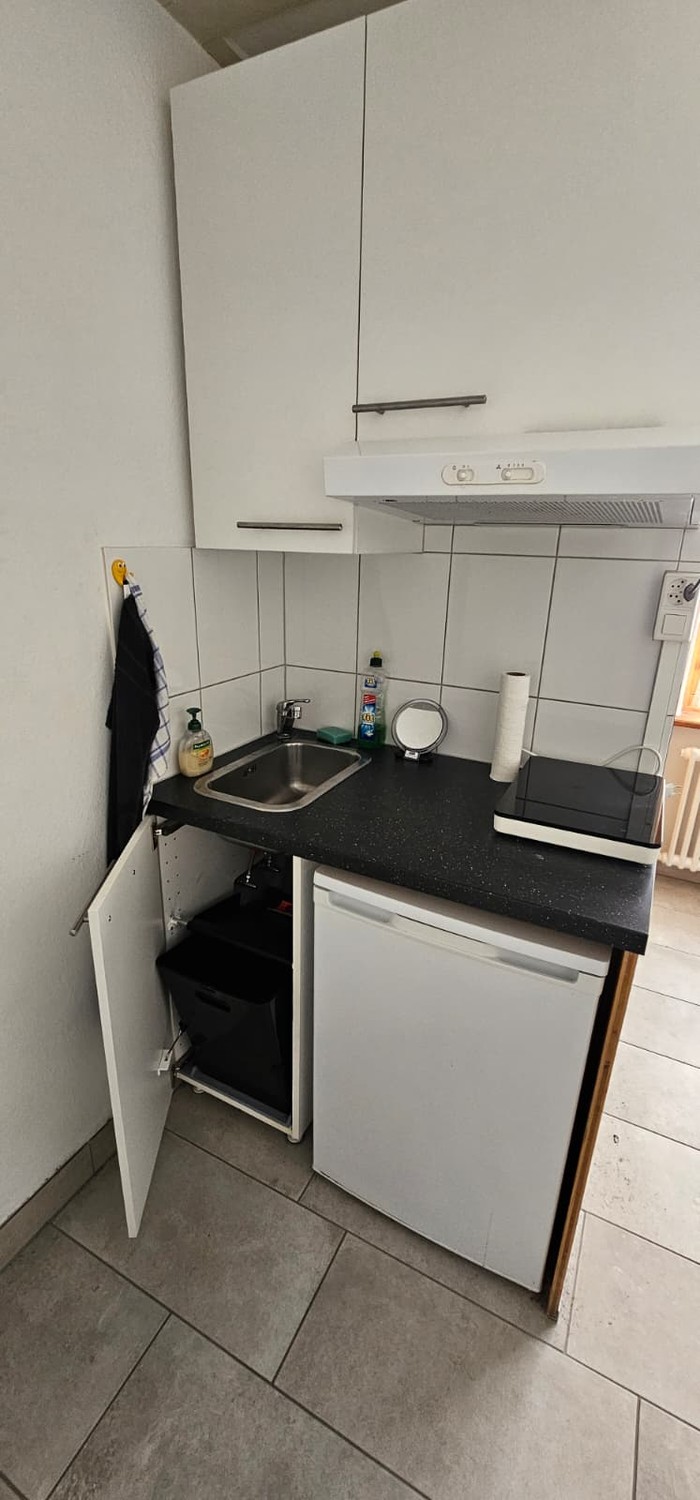 Miniküche im Zimmer: Praktisch mit mobiler Herdplatte, Kühlschrank und Waschbecken – ideal für unabhängiges Wohnen.