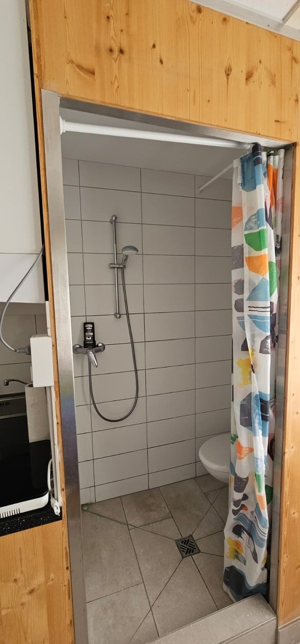 Bad: Private Dusche und Toilette kombiniert direkt im Zimmer.
