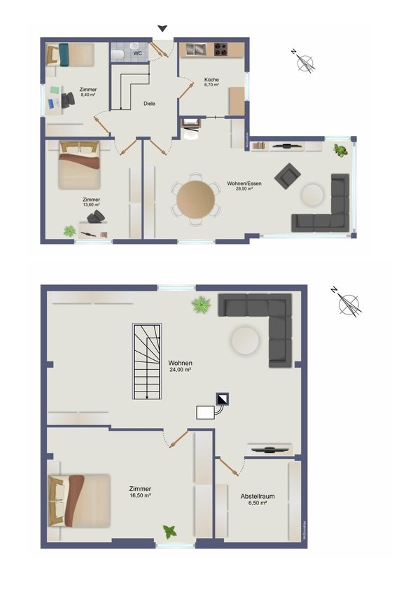 2 geschlossene Zimmer im Erdgeschoss, 1 zusätzliches Zimmer im Dachgeschoss
