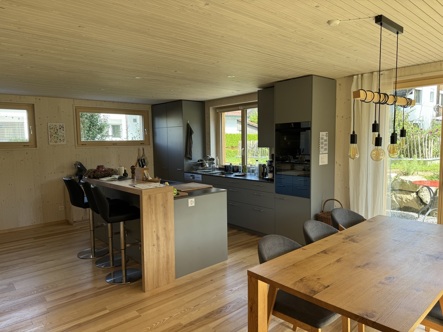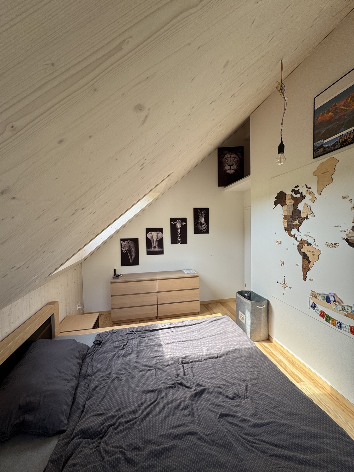 Das Zimmer befindet sich im DG eines 3-stöckigem Holzhauses mit Keller welches 2024 fertig gestellt wurde und hat 13.1 m2 Wohnfläche mit einer Dachschräge. Zudem hat es einen eigenem Zugang zum Balkon welcher mit einer Mitbewohnerin geteilt wird. Direkt gegenüber dem Zimmer befindet sich das Badezimmer mit Dusche und WC welches ebenfalls geteilt wird mit einer weiteren Person.