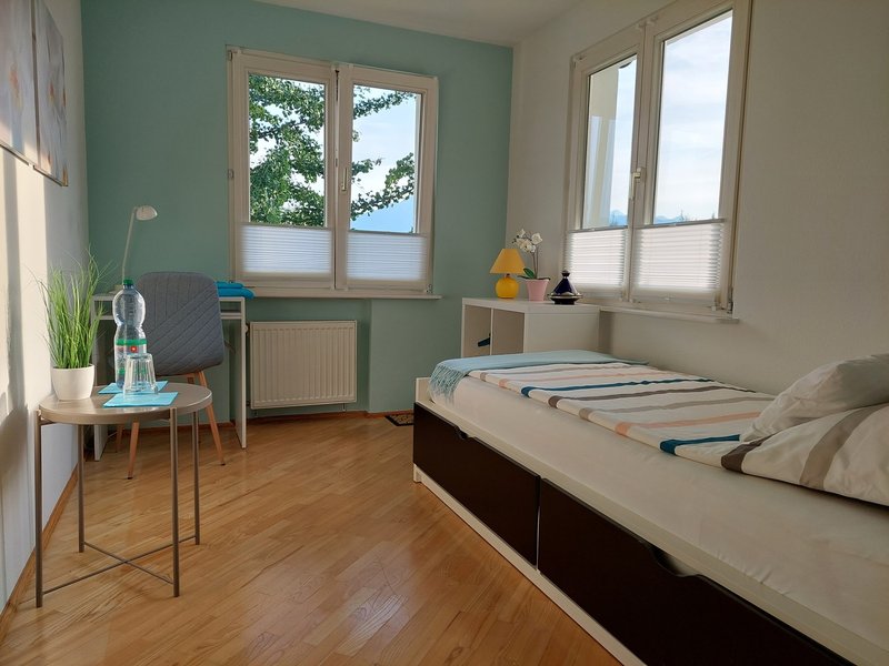 · Ein WG-Zimmer (ca. 9 m2) mit einem Bett, Schreibtisch, Kommoden und mit Sicht auf den See und die Stadt