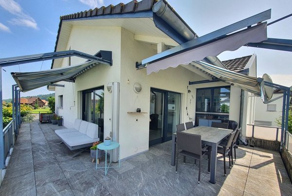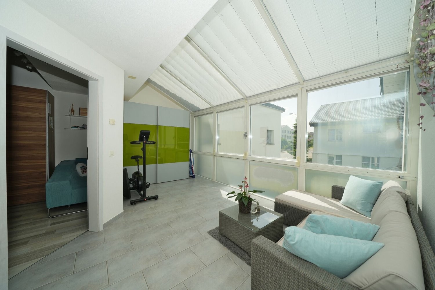 Die optimal besonnte Terrasse ist eine echte Oase: Ob entspannte Morgenstunden oder lange Sommerabende, hier geniessen Sie Sonne und Ruhe gleichermassen. Die Terrasse ist mit Sonnenstoren und Seitenmarkisen ausgestattet und bietet somit angenehmen Schutz vor direkter Sonneneinstrahlung und seitlichem Wind. Auf der anderen Seite der Wohnung erweitert ein verglaster Wintergarten den Wohnraum und bringt viel Licht sowie ein naturnahes Wohngefühl in die Wohnung.