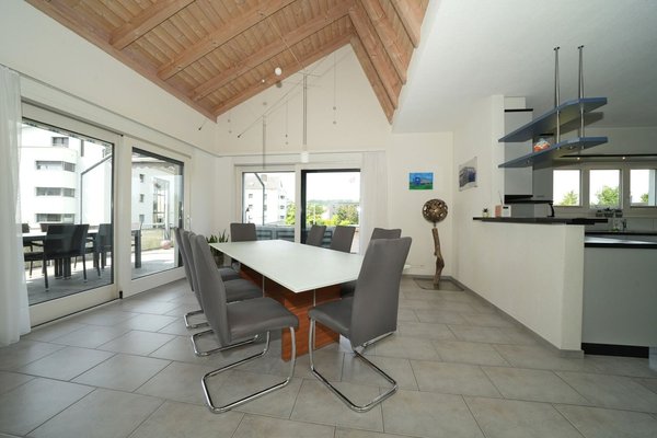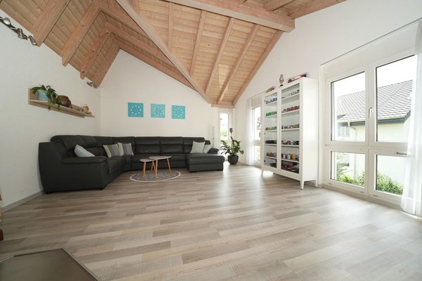 Diese grosszügige Maisonette-Dachwohnung bietet viel Wohnraum auf zwei Ebenen. Die Hauptwohnebene erstreckt sich über die gesamte erste Etage der Wohnung und besticht durch offene Raumstrukturen, sichtbare Dachbalken und ein charmantes Wohngefühl. Einige Trittstufen führen vom Essbereich hinauf zum leicht erhöhten Wohnzimmer - ein architektonisches Detail, das dem Raum Charakter verleiht und ihn elegant vom Essbereich abhebt. Der einladende Wohnbereich wird durch den stilvollen Schwedenofen ergänzt. Das Dachgeschoss wurde ausgebaut und isoliert. Dieser zusätzliche Wohnbereich eignet sich als Schlafbereich, Büro oder Hobbyraum.