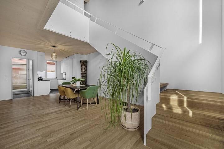 Das Haus befindet sich in neuwertigem Zustand und überzeugt durch eine moderne Holzbauweise, gefertigt aus zertifiziertem Schweizer Holz (FSC & PEFC). Das durchdachte Materialisierungskonzept kombiniert Eichenparkett und Keramikplatten, was dem Innenraum eine natürliche und zugleich elegante Atmosphäre verleiht.