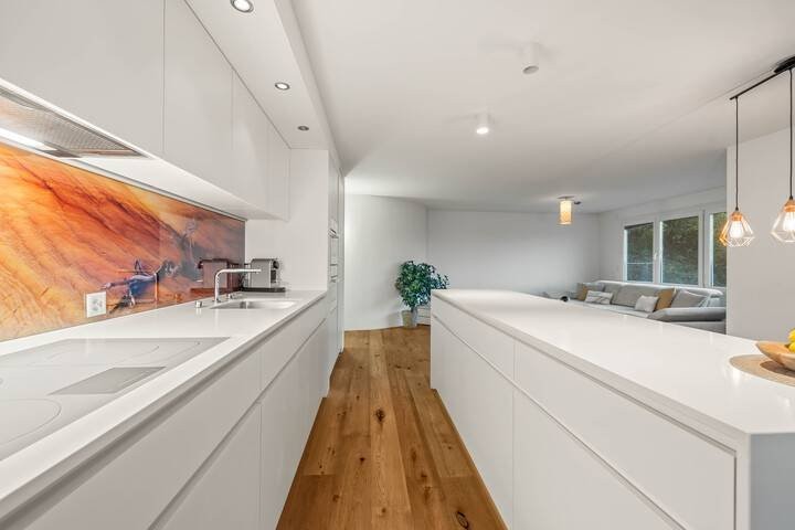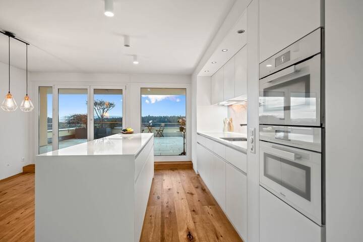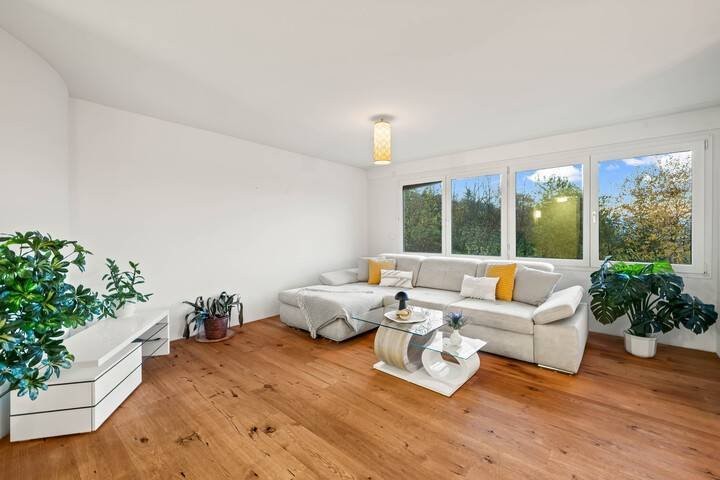 Die hochwertige Materialisierung mit Eichenparkett schafft eine warme Atmosphäre. Der Wohnbereich ist hell und einladend, mit direktem Zugang zur grosszügigen Sonnenterrasse, die mit ihren beeindruckenden 64 m² eine echte Erweiterung des Wohnraums darstellt. Hier geniesst man Weitsicht, Ruhe und viel Platz für Erholung im Freien.