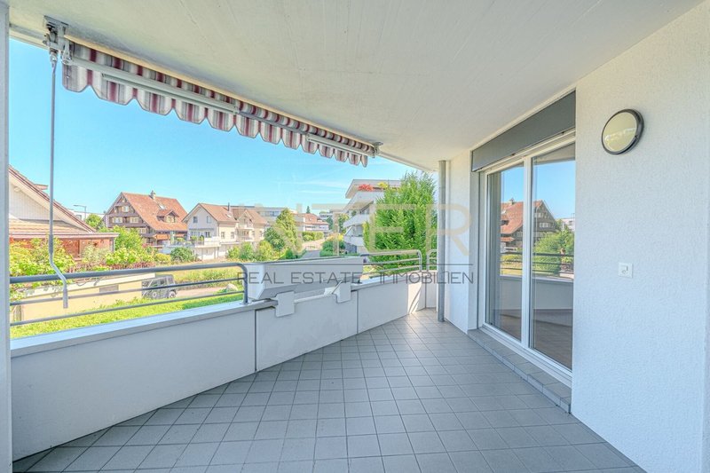 Vom grossen, überdachten Balkon geniessen Sie den Blick ins Grüne.