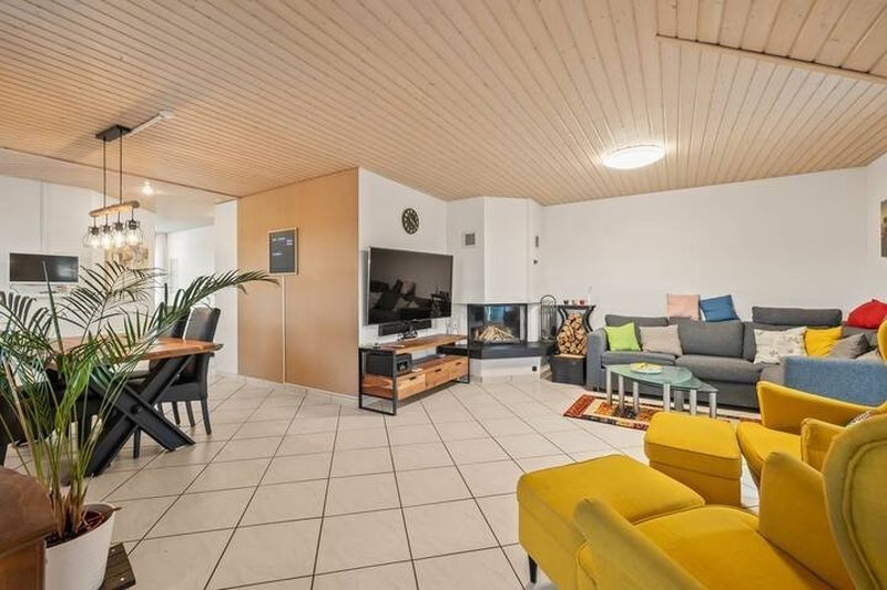 Der Wohn- und Essbereich ist lichtdurchflutet und grosszügig gestaltet. Ein gemütliches Cheminée sorgt für Atmosphäre, während der direkte Zugang zu zwei der drei Terrassen den Wohnraum nach draussen erweitert. Die Terrassen eröffnen eine schöne Weitsicht und bieten zu jeder Tageszeit einen passenden Platz im Freien.