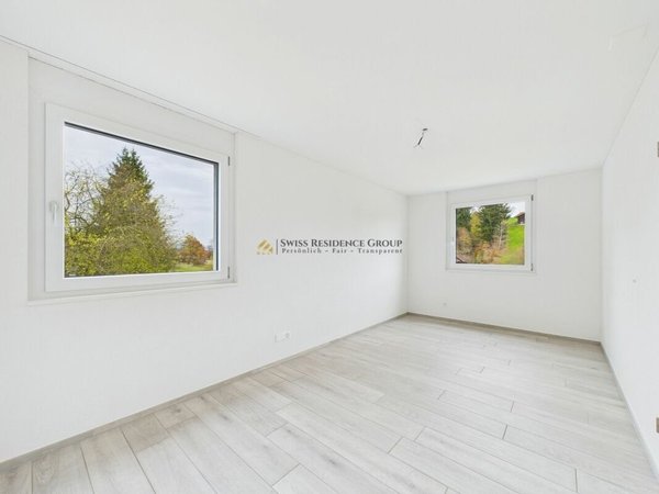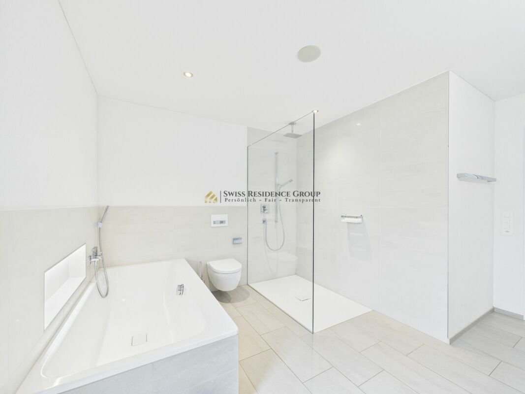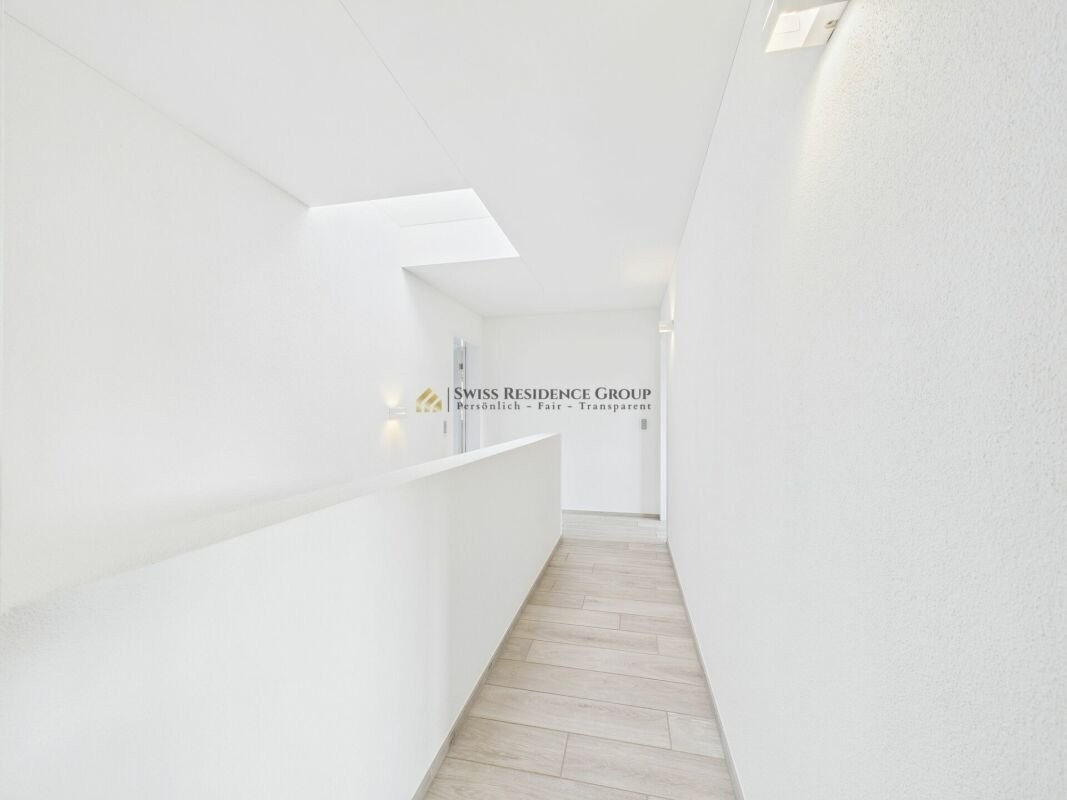 Das Obergeschoss beherbergt das elegante Hauptschlafzimmer mit eigener Ankleide und privatem Ensuite-Bad. Ergänzt wird die Etage durch ein Kinderzimmer, einen Fitnessraum sowie ein weiteres grosszügiges Badezimmer mit Badewanne, Dusche und WC.