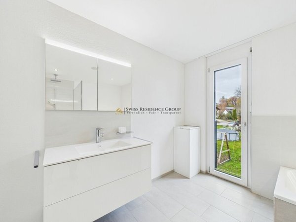 Zusätzlich verfügt das grosse Familienbad im Obergeschoss über einen praktischen Wäscheabwurf. Ein weiterer Wäscheabwurf im Erdgeschoss sorgt dafür, dass auf beiden Etagen dieser Komfort zur Verfügung steht.