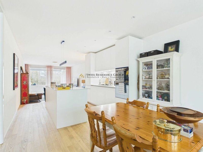 Der offene Wohn- und Essbereich mit moderner Küche bildet das Herzstück der Wohnung und schafft dank grosszügiger Fensterfronten eine helle, freundliche Atmosphäre. Der Balkon mit Blick ins Grüne lädt zum Entspannen ein und bietet einen ruhigen Rückzugsort mitten in einer attraktiven Wohnanlage.