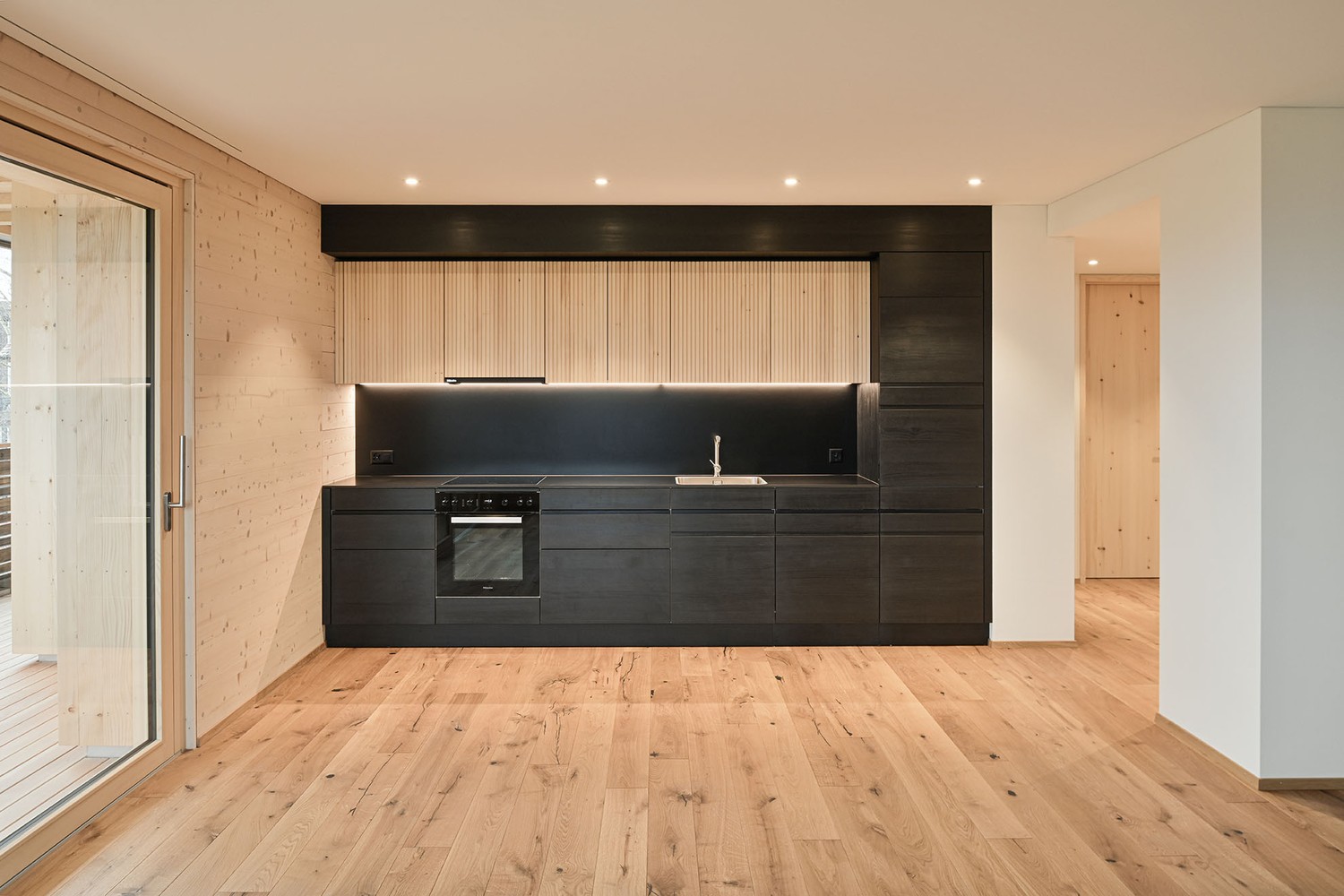 Die Küche ist aus Massivholz (Fichte in Mondholz) hergestellt und mit japanischer Tinte schwarz eingefärbt worden. Für die Abdeckung und Rückwand wurde Keramik gewählt.