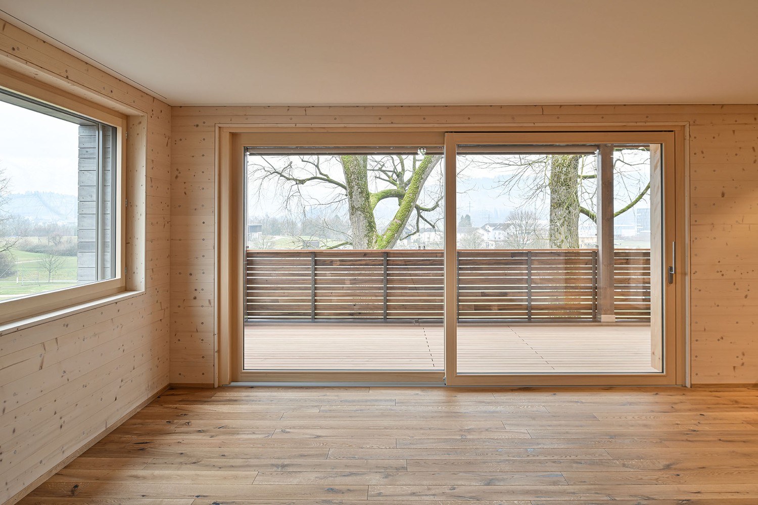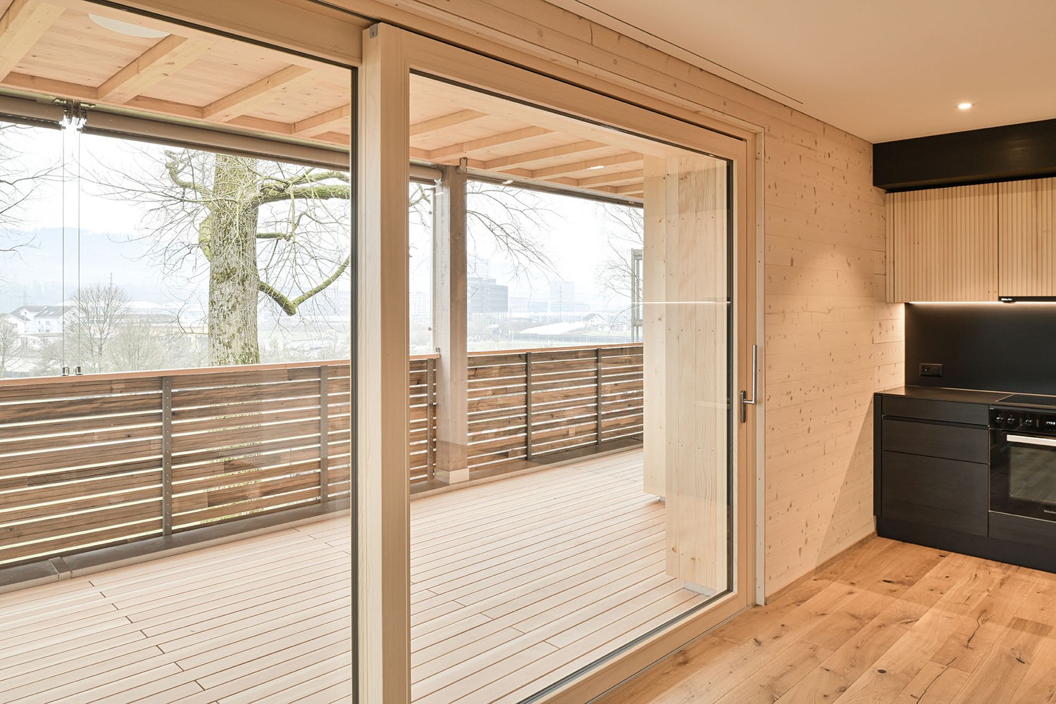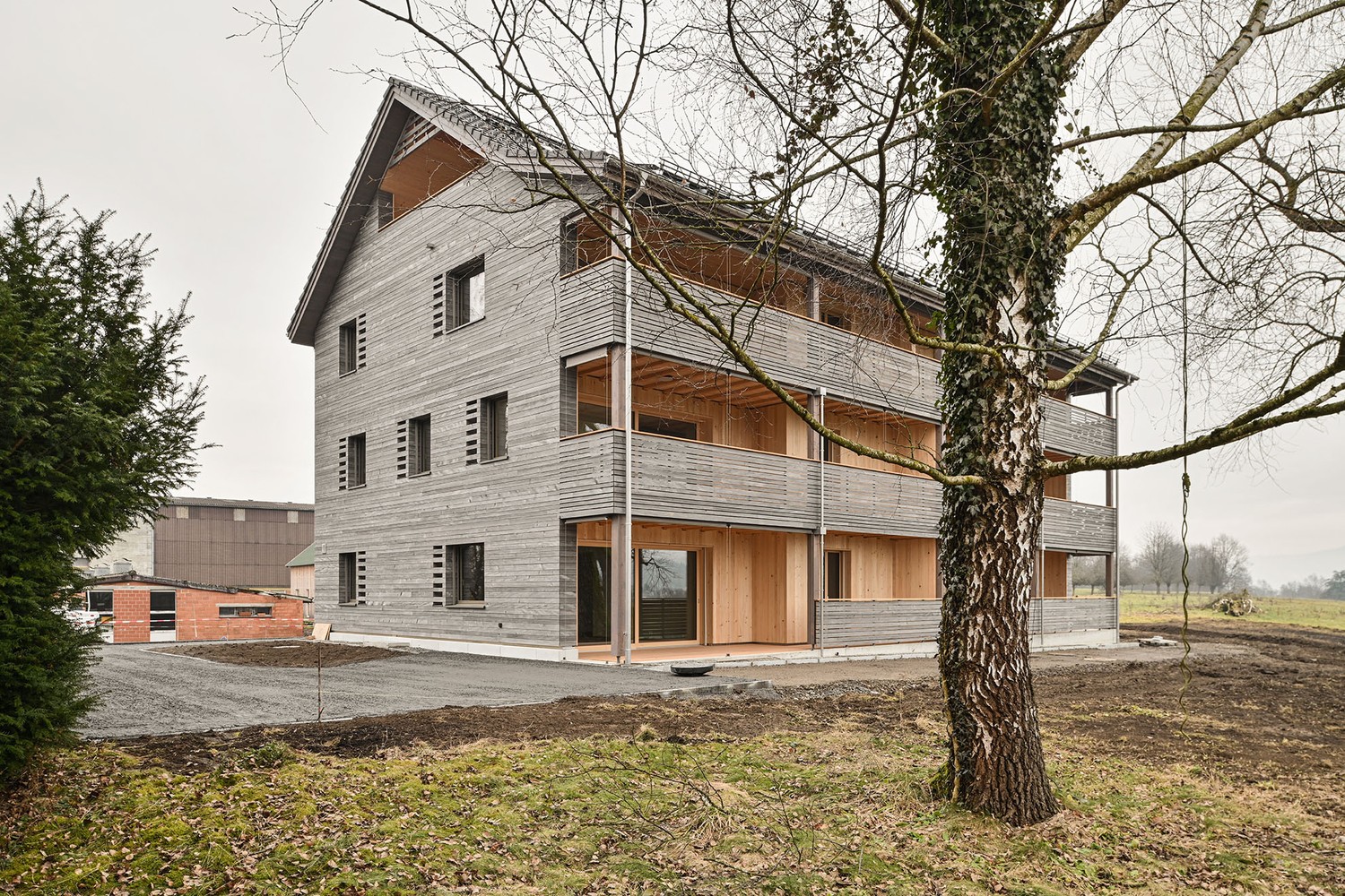 Das 5-Familienhaus wurde im Massivholzbau Holz100 (Mondholz) erstellt.