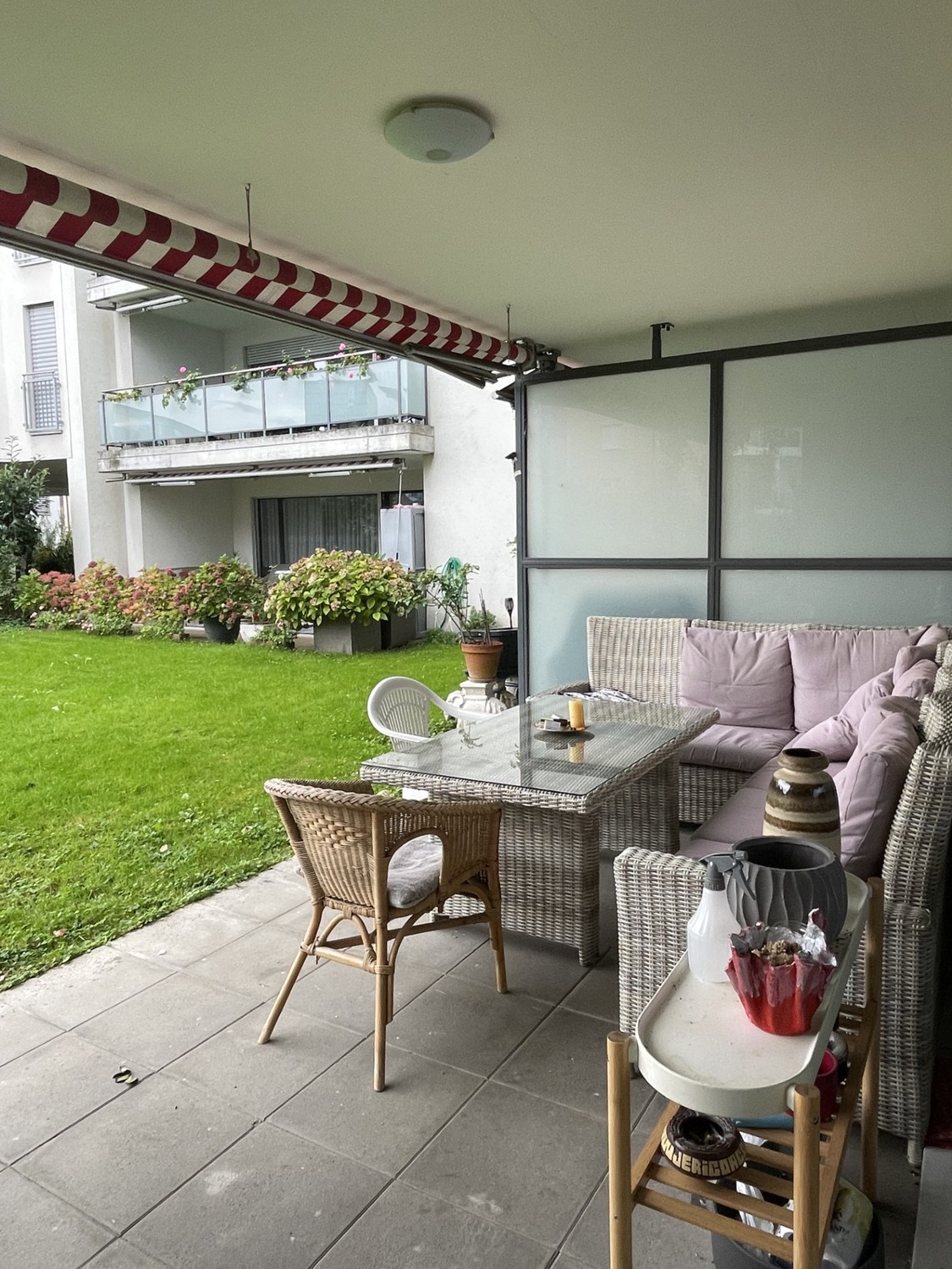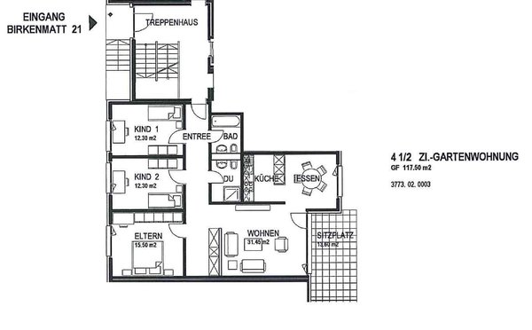 Die Wohnung ist 117.5 m² gross, hat 2 Badezimmer, ein grosszügiges Wohnzimmer und einen Gartensitzplatz mit einer gemütlichen Lounge.