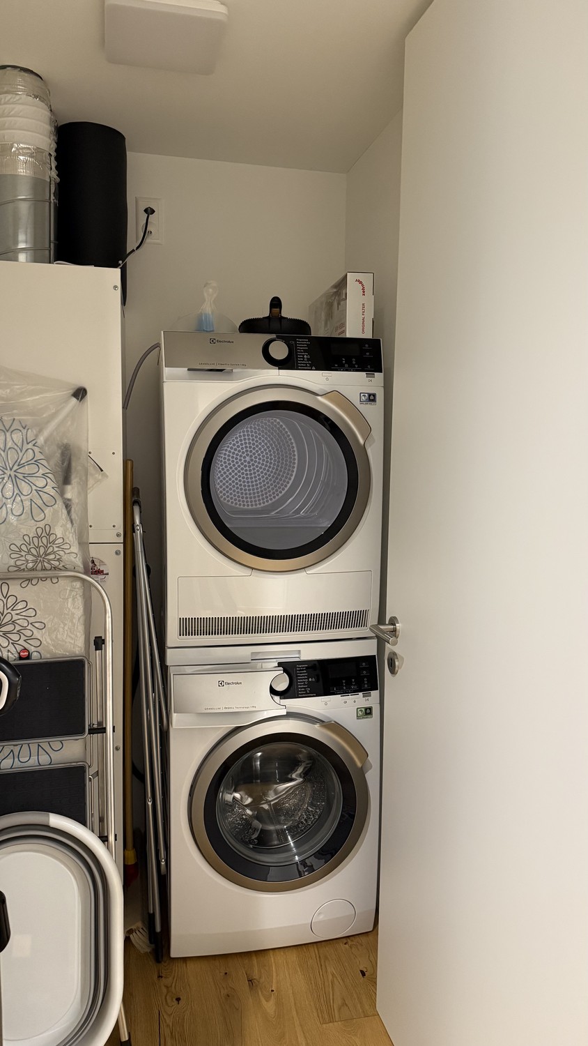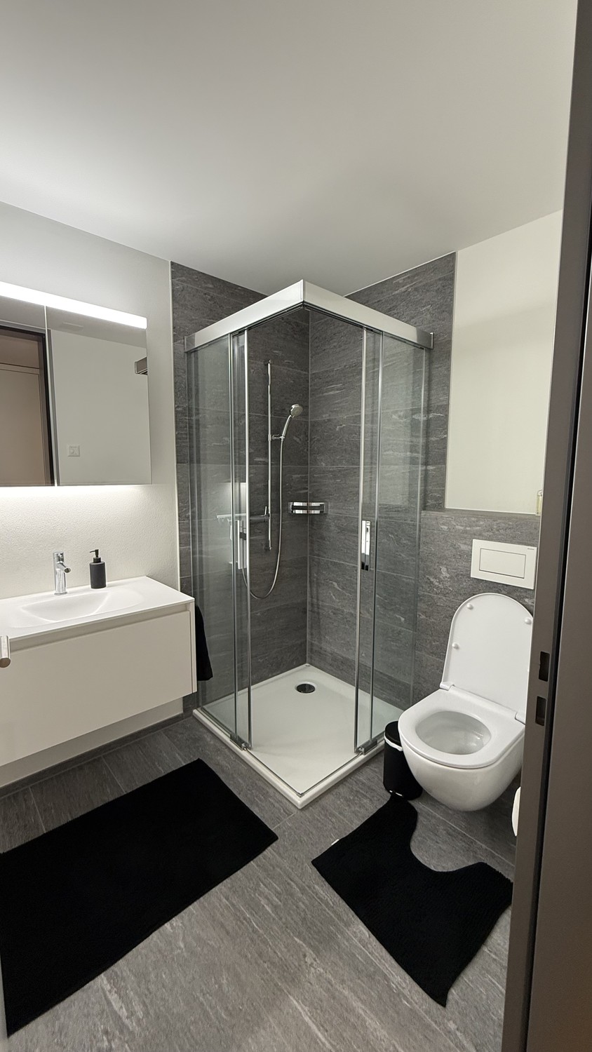 Die Wohnung hat zwei Badezimmer (pro Person eine eigene), eine Waschküche und eine grosse Terasse und Wohnzimmer - Küchen Bereich.