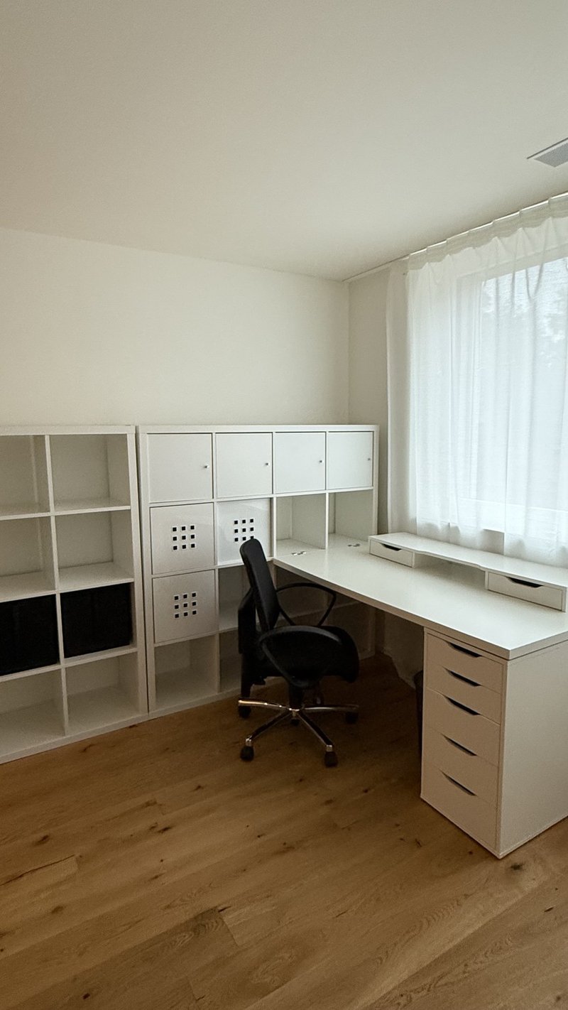Das Zimmer hat bereits ein Bett & Bürotisch mit Regalen vorhanden, ein Schrank würde allerdings fehlen. Vom Zimmer sieht man eine kleine Ecke vom See.