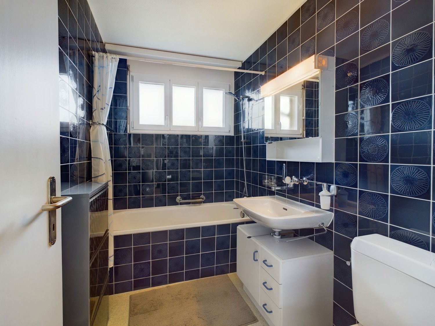 Das Schlafzimmer bietet mit einem geräumigen Einbauschrank ausreichend Stauraum und verfügt über einen zweiten Balkon (4.5 m²), ideal für ruhige Momente und den Genuss des Sonnenuntergangs. Das Badezimmer ist mit Badewanne, Lavabo und WC ausgestattet. Ein hochwertiger Laminatboden sorgt in der gesamten Wohnung für eine warme und gemütliche Atmosphäre.