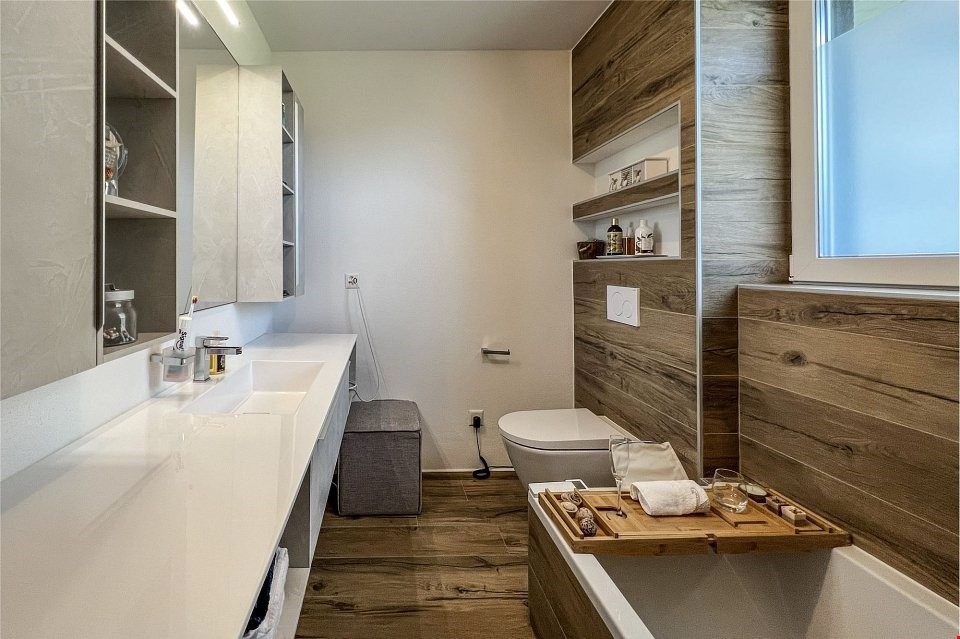 Il piano sottostante è dedicato alla zona notte e comprende una camera matrimoniale con cabina armadio e bagno en suite, due ulteriori camere da letto e un terrazzo coperto con spazio predisposto per jacuzzi. Completa il piano un ulteriore bagno con doccia.