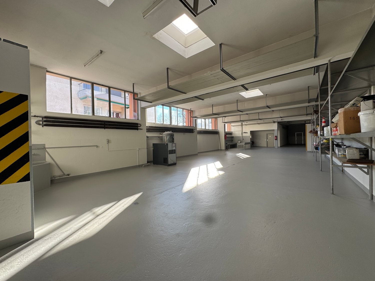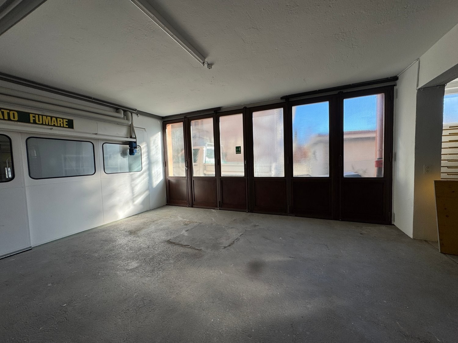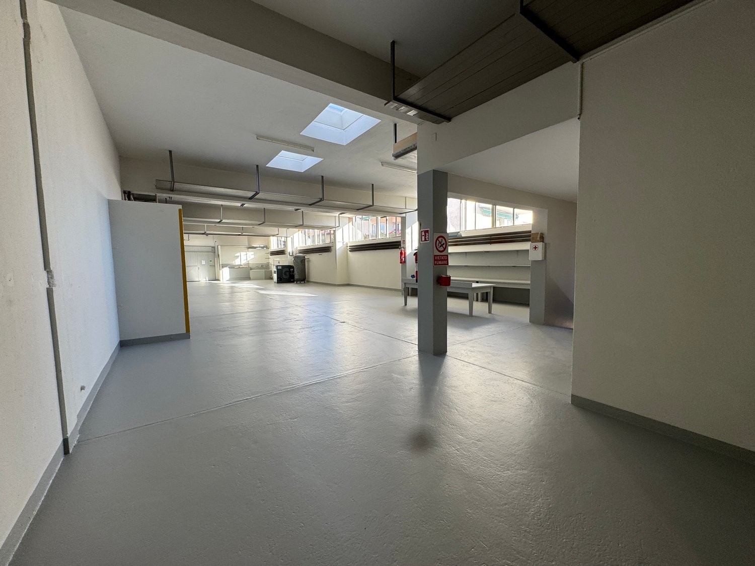 • il piano terreno destinato ad oggi come laboratorio (altezza utile sotto le travi 3.20 m, sotto soletta 4.00 m, con due porte in testata e dall’annesso posteriore. Il solaio a pavimento è accessibile con veicoli medi.