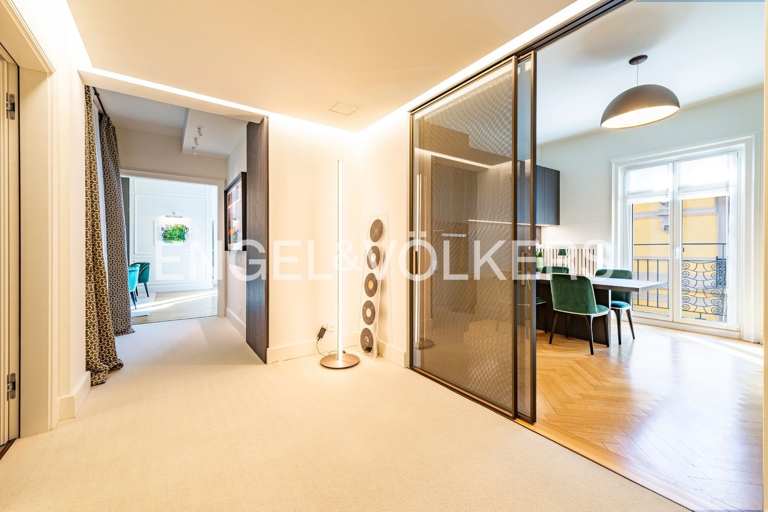 Das Objekt verfügt über ein grosszügiges, helles Wohnzimmer, eine vollständig ausgestattete Küche, drei Schlafzimmer, drei Badezimmer, eine grosse Terrasse mit Seeblick, zwei begehbare Garderoben und massgefertigte Einbauschränke. Der Wohn- und Schlafbereich sind durch einen breiten Korridor geschickt getrennt, was Privatsphäre und Komfort gewährleistet.