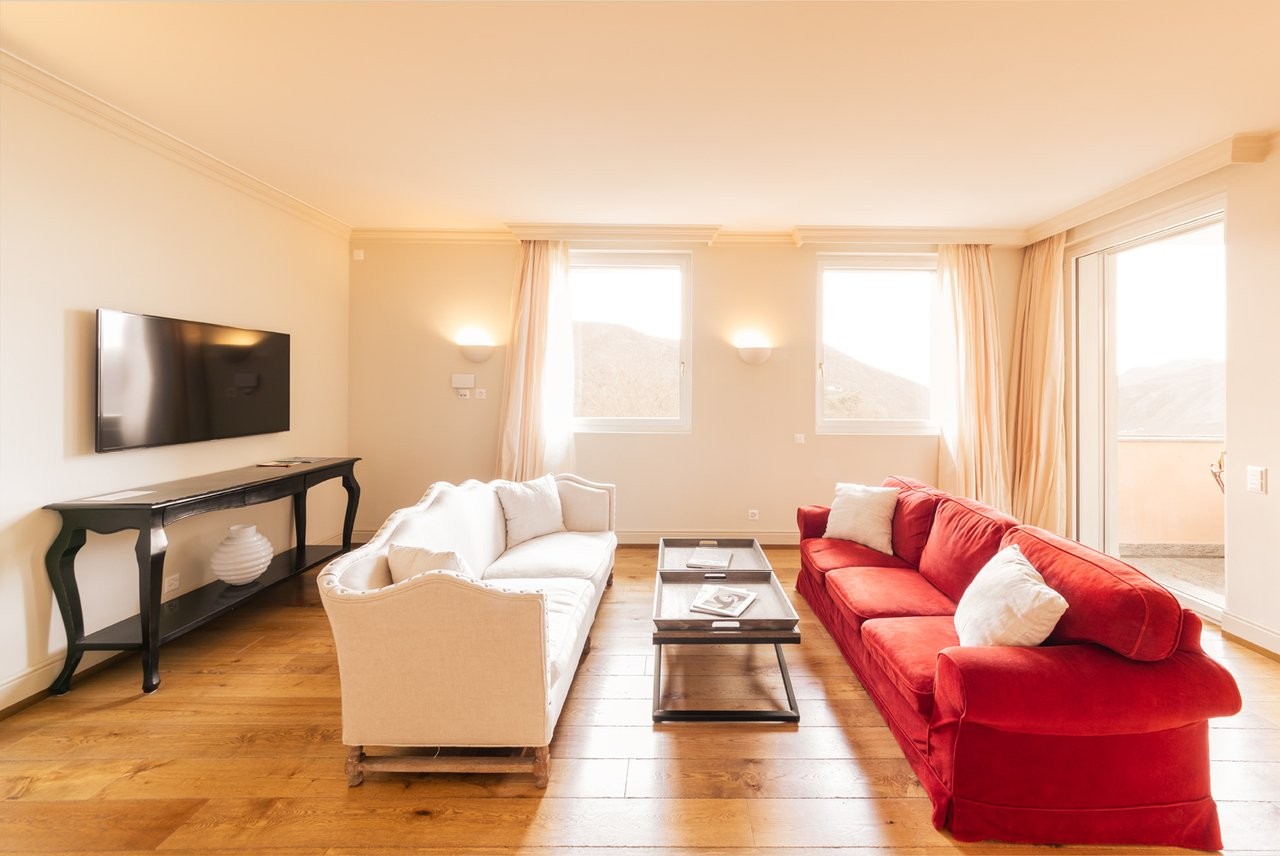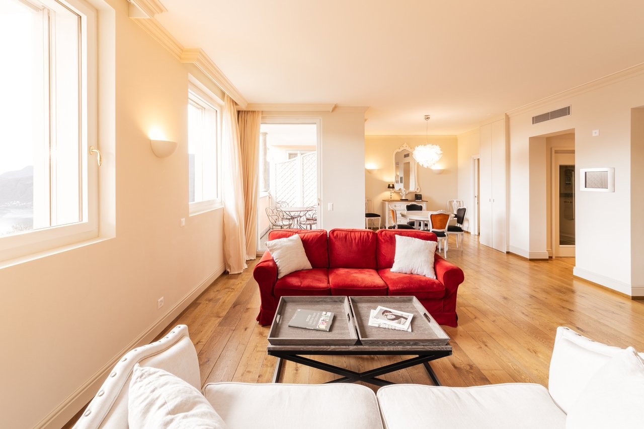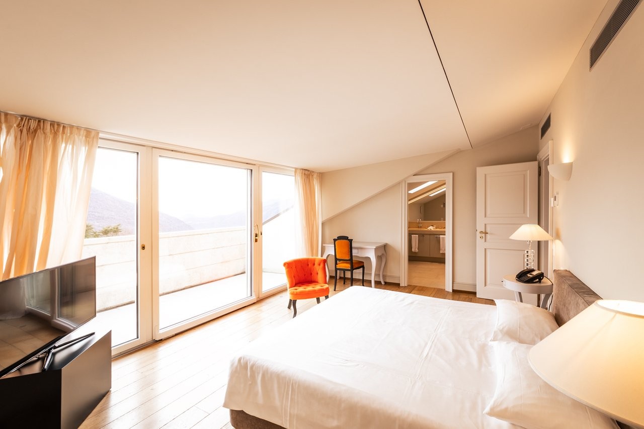 A luxury resort set in a stunning natural environment, panoramic views as far as the eye can see of the Alps and lake Lugano, Top tier apartments and finishes, wide ranging sports facilities for its residents plus 24/7 hotel services available on request combine to provide the pinnacle of refined luxury living at this Collina d'Oro Resort in Agra. The duplex apartment 606 606 S of which it is part is characterised by its large surface area, the elegance of its spacious and bright rooms and the privacy it offers.