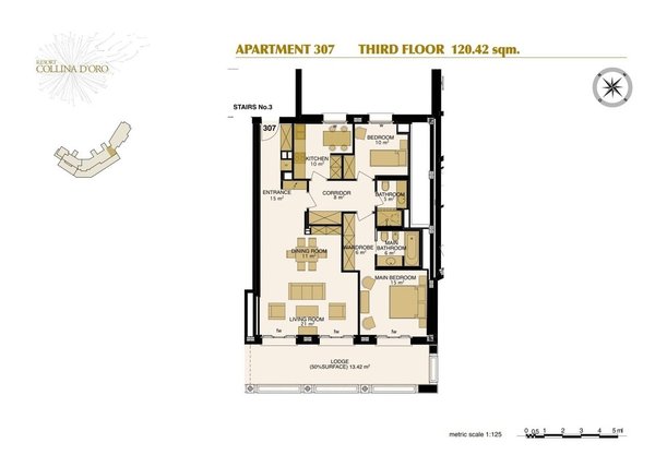 Sia il soggiorno che la camera padronale aprono sulla bella loggia che occupa la parte frontale e garantisce il panorama da cartolina che ha reso famoso il Resort Collina d'Oro oltre che per la varietà dei servizi offerti.
