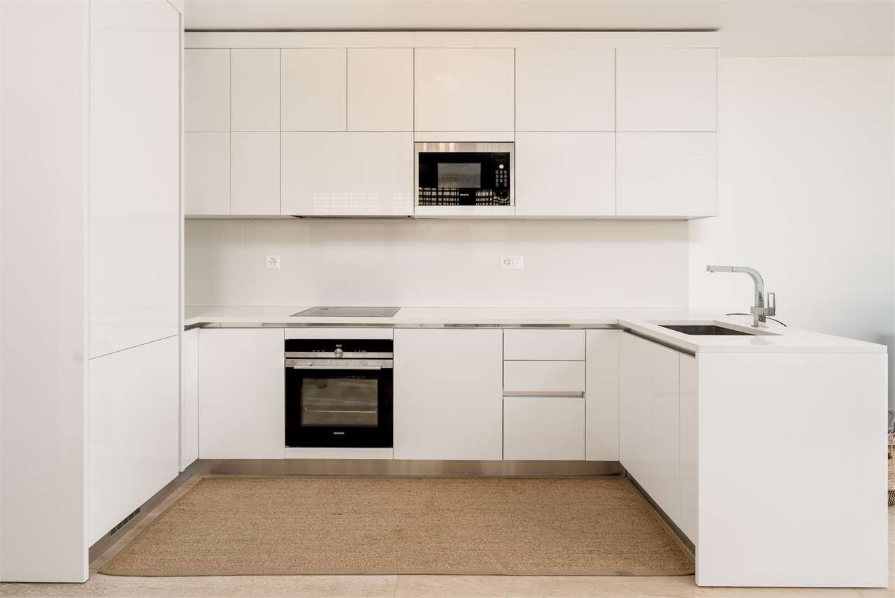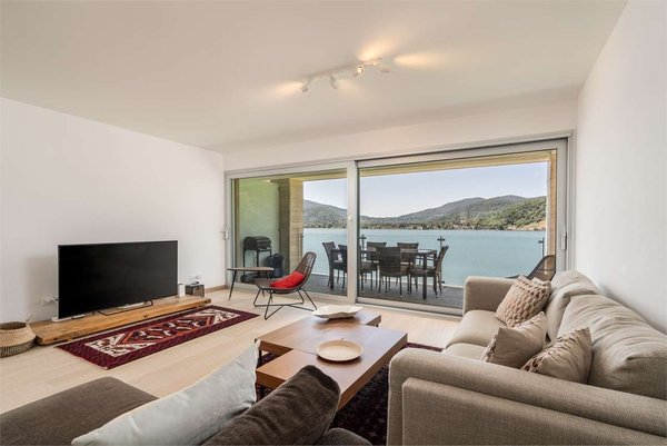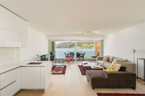 The apartment is located on the second floor of an exclusive residence and features a bright living room with an open-plan kitchen, offering a splendid view of the lake. A spacious terrace of approximately 14 m² invites you to enjoy tranquil moments outdoors.
