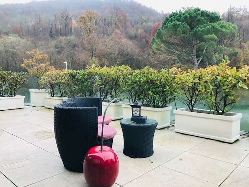 Il vero gioiello di questo attico è la meravigliosa terrazza panoramica, unestensione naturale della zona giorno. Qui è possibile organizzare cene allaperto, momenti di svago con amici e familiari, oppure semplicemente godersi la vista sul paesaggio circostante, tra natura e colline