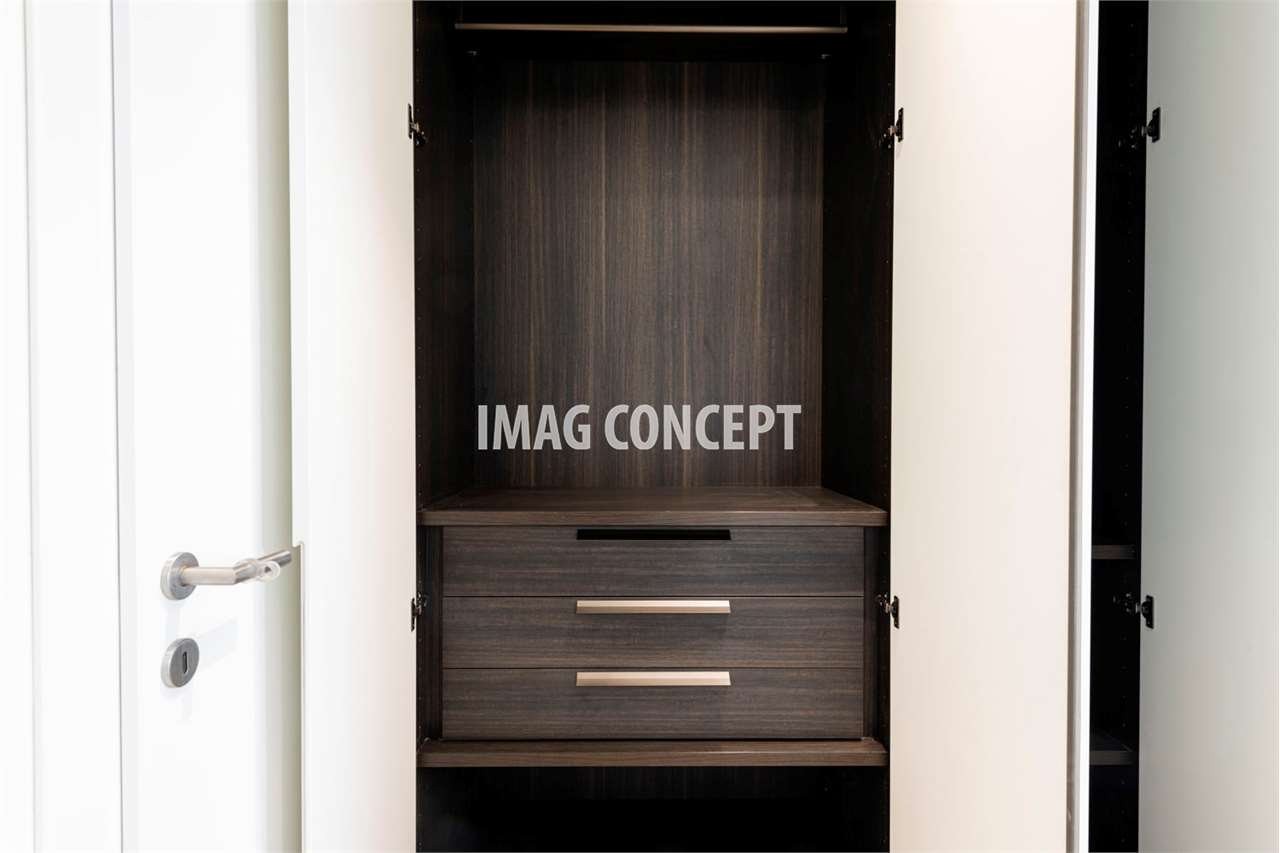 L'appartamento, al 2. piano, si presenta con un ingresso dotato di armadi a muro realizzati su misura Cappellini, soggiorno / sala da pranzo con cucina Cappellini a vista, bagno con doccia e locale lavanderia, ampio balcone coperto di 13 mq con vista aperta.