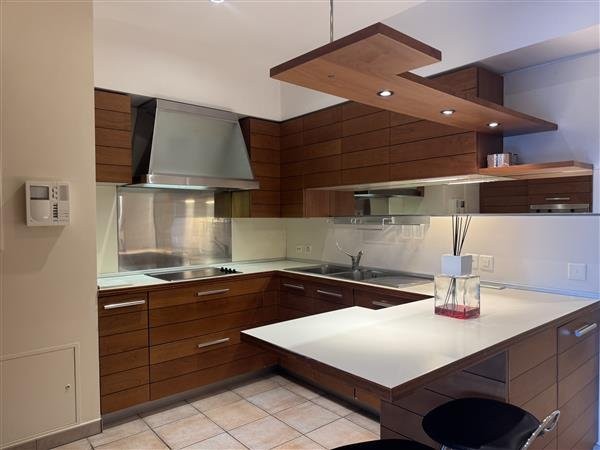 L'appartamento è composto da ingresso; cucina attrezzata, soggiorno con zona pranzo e camino che si apre su una veranda coperta e su un grande giardino privato; bagno di servizio con doccia; grandi armadiature, camera padronale con bagno en suite con vasca (altezza 2.60 m); due camere da letto singole/studio, bagno con doccia (altezza massima 2.25, riscaldamento con radiatori elettrici).