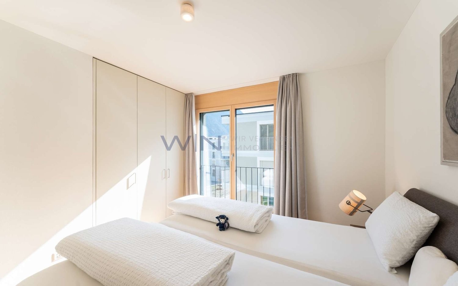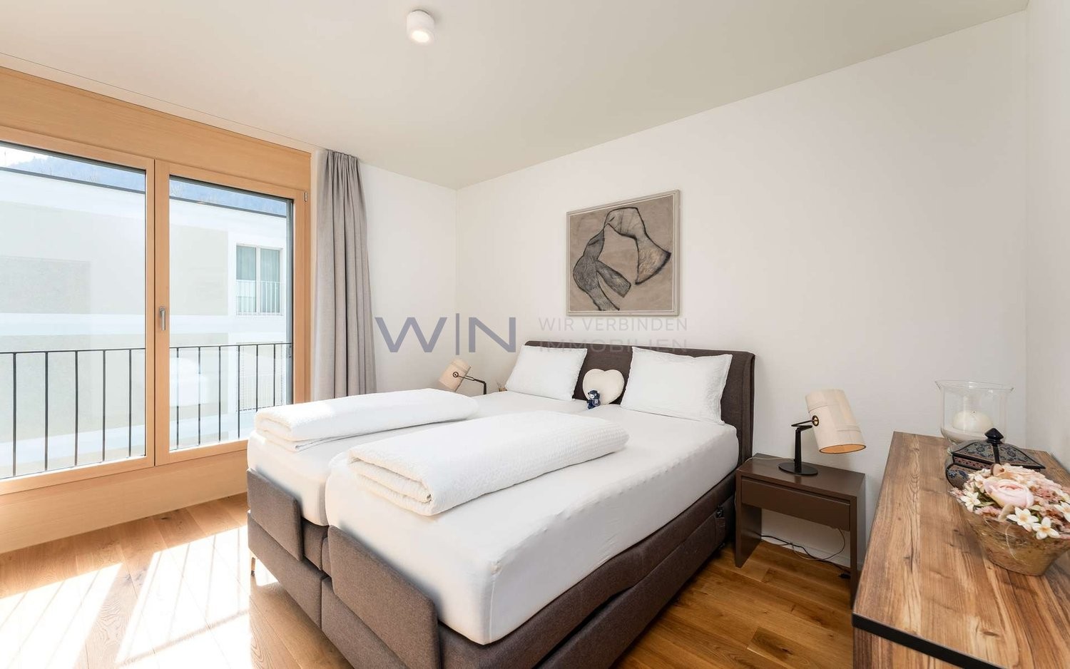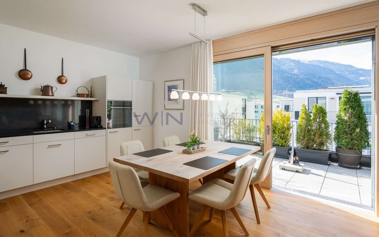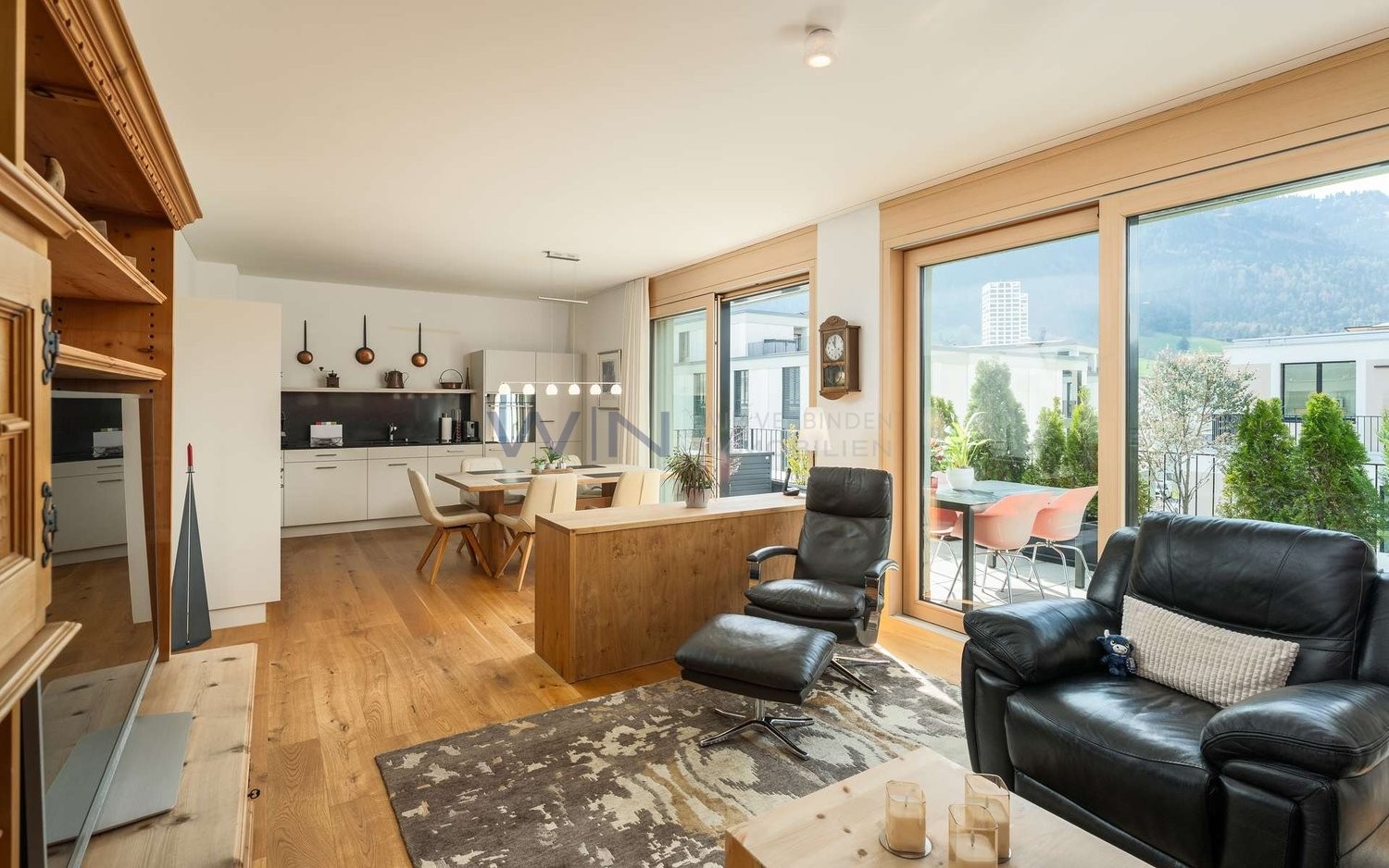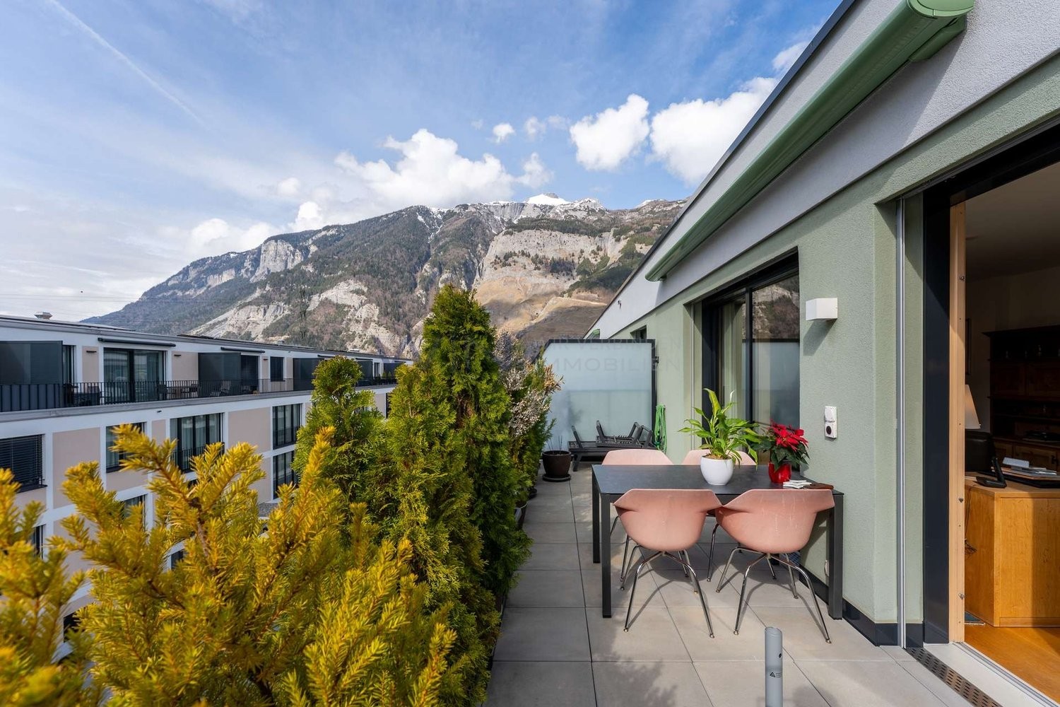 Schon beim Betreten der Wohnung empfängt Sie ein heller Eingangsbereich, der Sie direkt in den grosszügigen Wohn- und Essbereich führt ? ein offener, lichtdurchfluteter Raum mit Blick in die schöne Berglandschaft. Von hier aus gelangen Sie auf die private Terrasse, die zum Entspannen in ruhiger Umgebung einlädt. Die beiden Schlafzimmer liegen angenehm separiert und bieten eine ruhige Rückzugsmöglichkeit. Ergänzt wird die Wohnung durch ein modernes Badezimmer sowie einen praktischen separaten Raum für den Waschturm innerhalb der Wohnung. Abgerundet wird das Angebot durch zusätzlichen Stauraum im Keller sowie einen komfortablen Tiefgaragenplatz mit Elektroladestation und Abstellbereich.