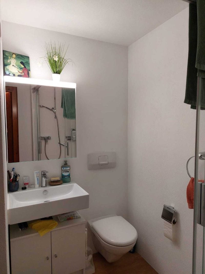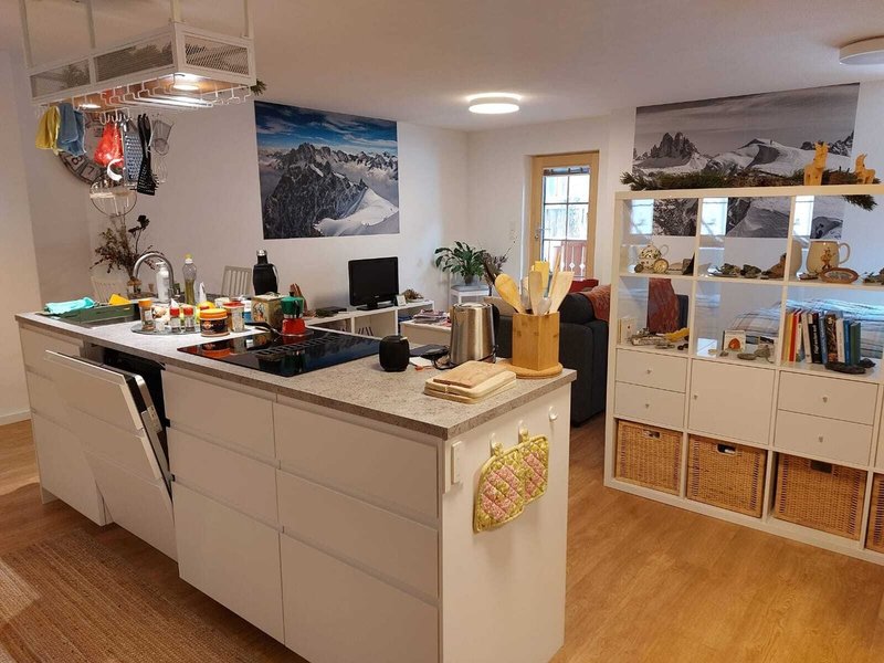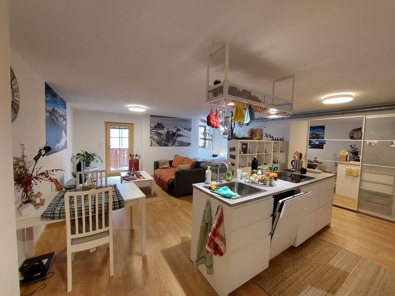 Schönes, gemütlich und geschmackvoll eingerichtetes Studio mit Küche, Schlafbereich und zusätzlich zum Doppelbett (1.6mx2,2m) ein Schlafsofa für 2 Personen. Wohnung ist eher dunkel. ABER super Licht, 40m², im 1. Stock, 1 Balkon, Öffentliche Parkplätze in der Nähe. Inkl. Heizung, Strom, Wasser, Internet, ...