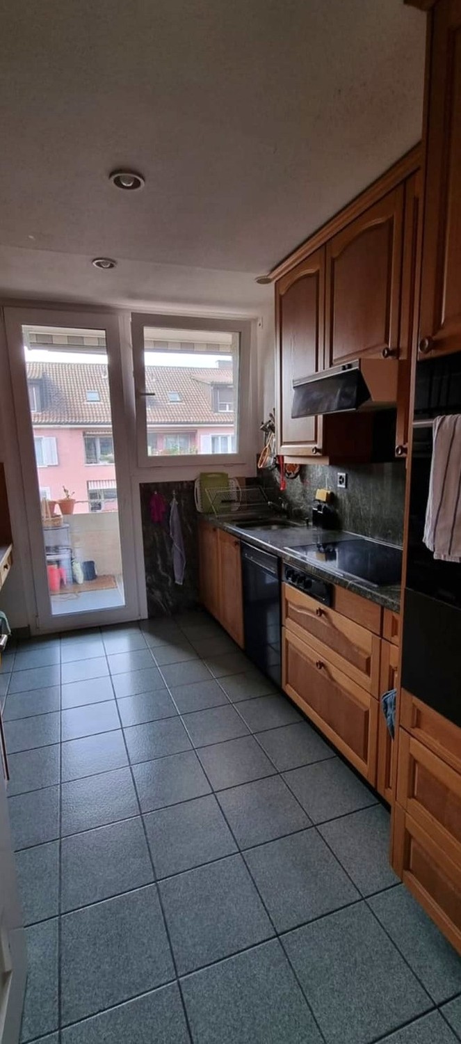 The apartment is on the 4th floor, very bright, and well connected to the city center. It is located at Albisriederstrasse, 8003 Zurich, with excellent public transport connections. The flat is shared by three people in total.