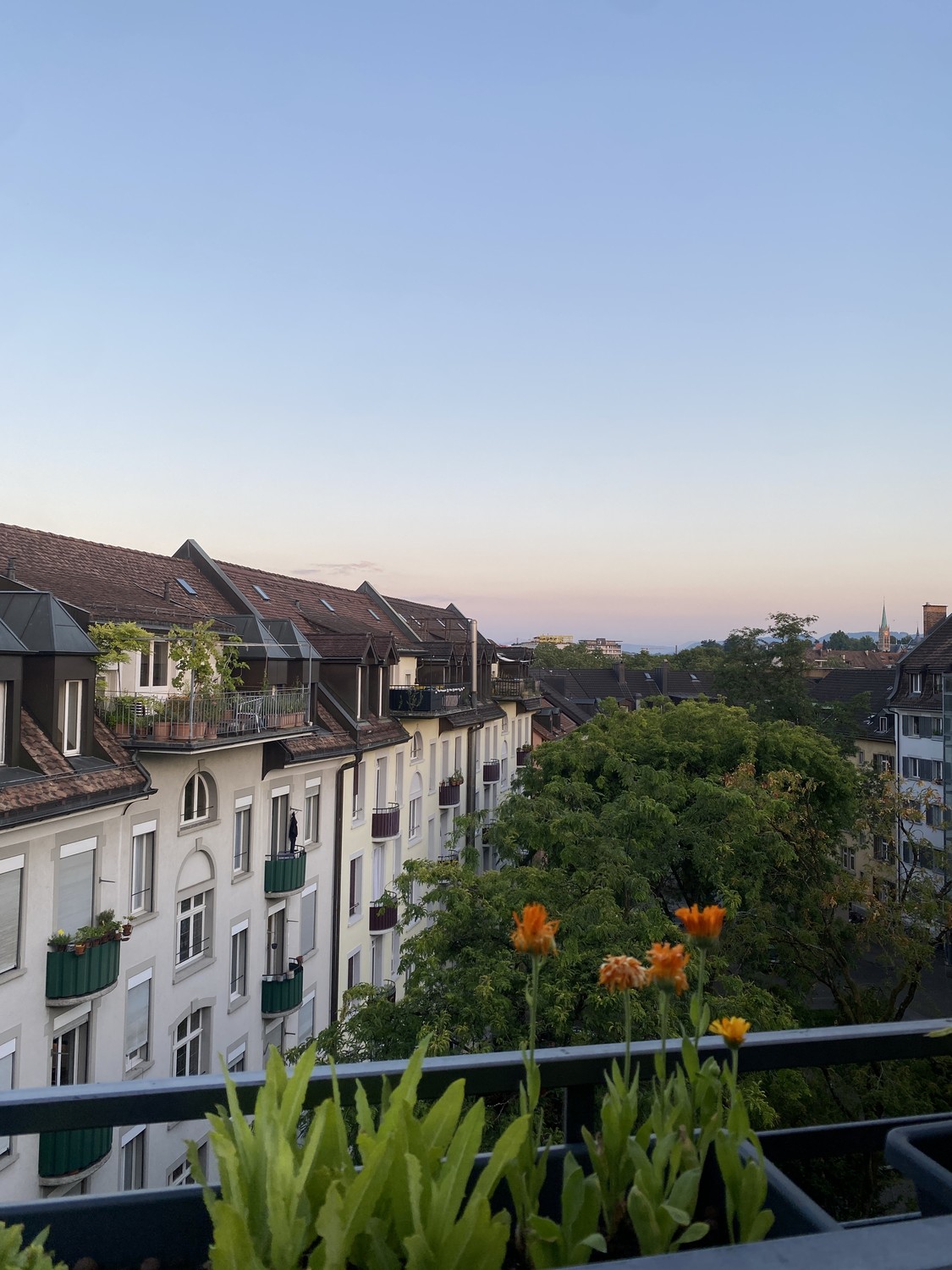 Der gemeinsame Balkon ist zum Innenhof ausgerichtet, bei guter Sicht sieht man die Alpen