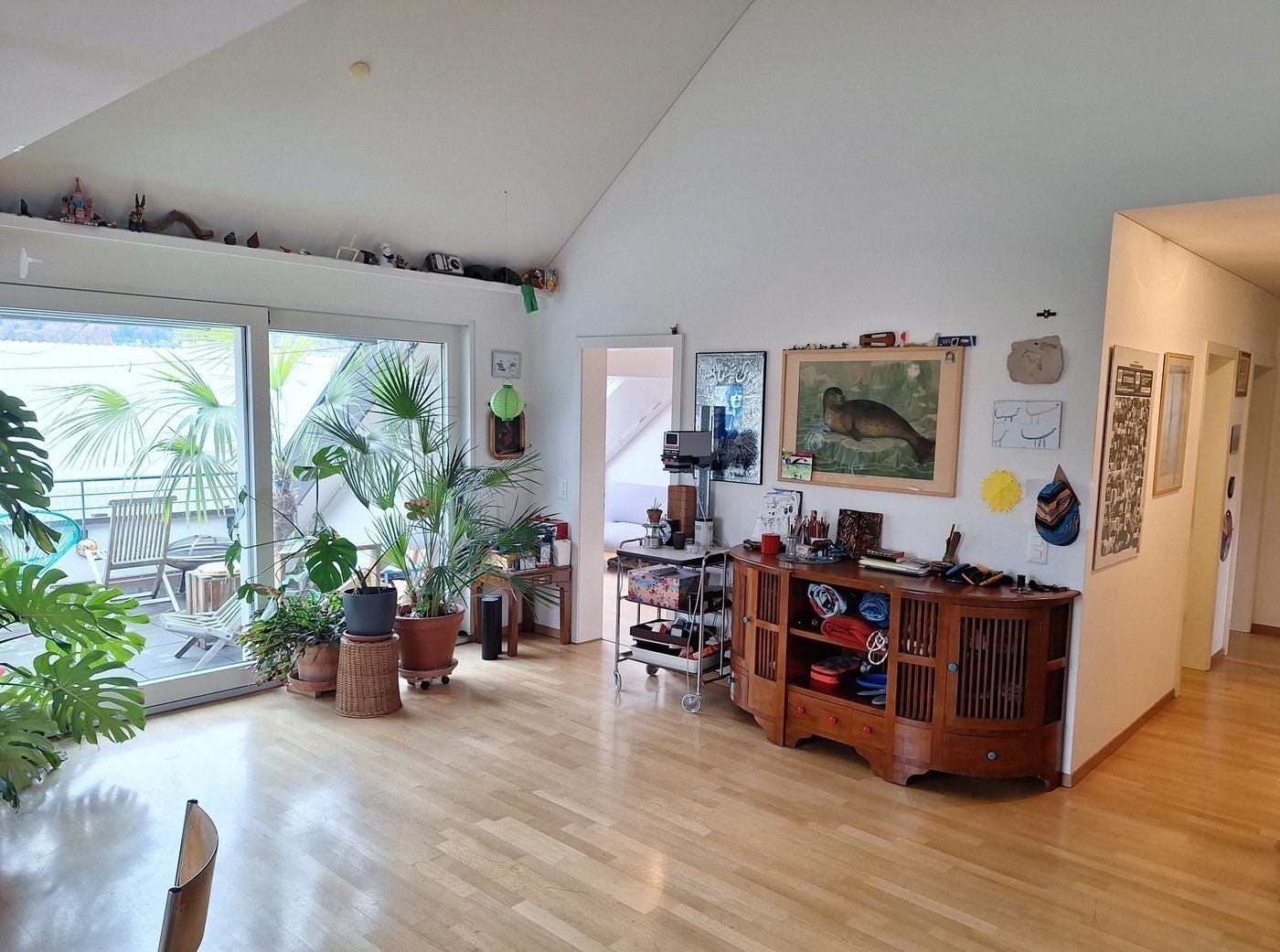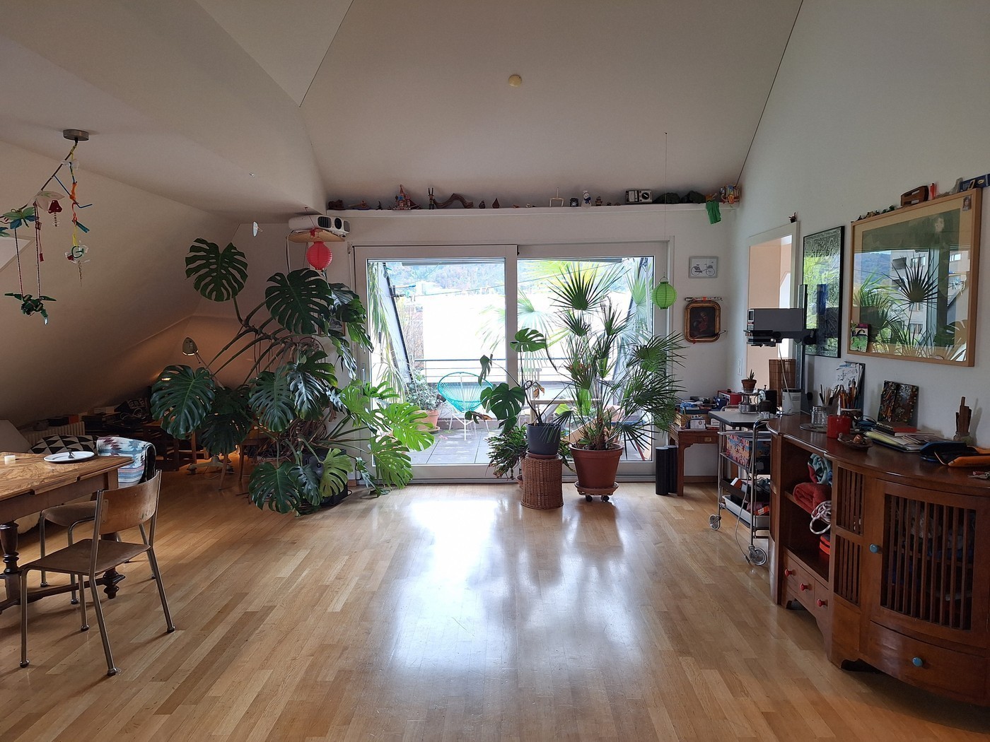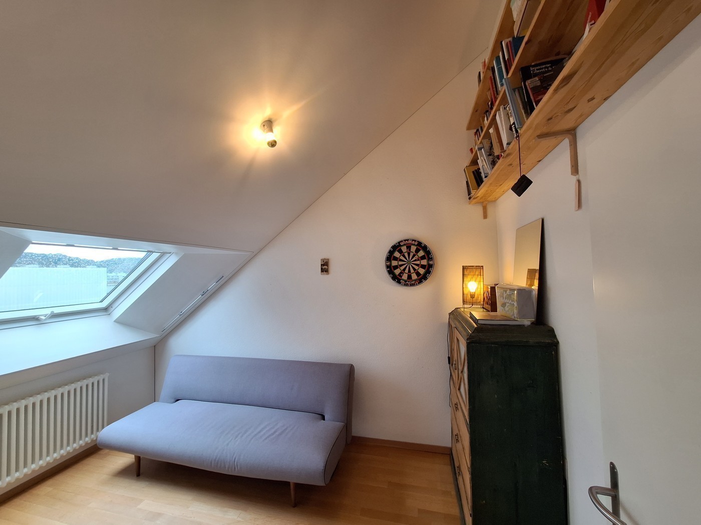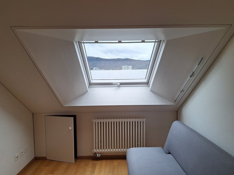 9.5 m2-room with a pitched roof up to 3.75 m high and a south-facing window (view of the Uetliberg). It is furnished with a sideboard and a sofa bed (both removable).